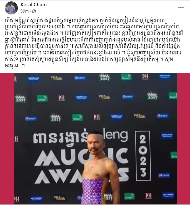 ជាមួយគ្នានេះផងដែរ ឯកឧត្តម ជុំ កុសល រដ្ឋលេខាធិការក្រសួងព័ត៌មាន នៅថ្ងៃទី២០ ខែមីនានេះ បានបង្ហាញនូវមតិជុំវិញរឿងរ៉ាវមួយនេះដោយឯកឧត្តមបានសរសេររៀបរាប់ថា៖ «បើតាមខ្ញុំធ្លាប់ស្តាប់គាត់ផ្តល់កិច្ចសម្ភាសន៍កន្លងមក គាត់គឺជាអ្នករៀនជំនាញច្នៃម៉ូតបែបស្រមើស្រមៃមកពីប្រទេសបារាំង។ ការច្នៃនៃបែបស្រមើស្រមៃនេះគឺច្នៃតាមអារម្មណ៍ស្រមើស្រមៃរបស់ខ្លួនដោយមិនចម្លងពីគេ។ ឃើញគាត់ស្លៀកពាក់បែបនេះ ខ្ញុំឃើញបងប្អូនយើងមួយចំនួននាំគ្នាស្តីជេរគាត់ តែធាតុពិតគាត់ធ្វើបែបនេះគឺជាការបង្ហាញជំនាញរបស់គាត់ ដែលនៅកម្ពុជាយើងគ្មាននរណាអាចធ្វើបានដូចគាត់ទេ។ សូមស្វែងយល់ឲ្យច្បាស់អំពីសិល្បៈវប្បធម៌ និងការច្នៃម៉ូតបែបស្រមើស្រមៃ ។ នៅអឺរ៉ុបគេស្លៀកប្លែកជាងនេះខ្លាំងណាស់។ ខ្ញុំសូមអធ្យាស្រ័យ មិនការពារគាត់ទេ គ្រាន់តែសុំឲ្យបងប្អូនសិក្សាស្វែងយល់និងបែងចែកឲ្យច្បាស់មុននឹងប្រតិកម្ម ។ សូមអរគុណ»។