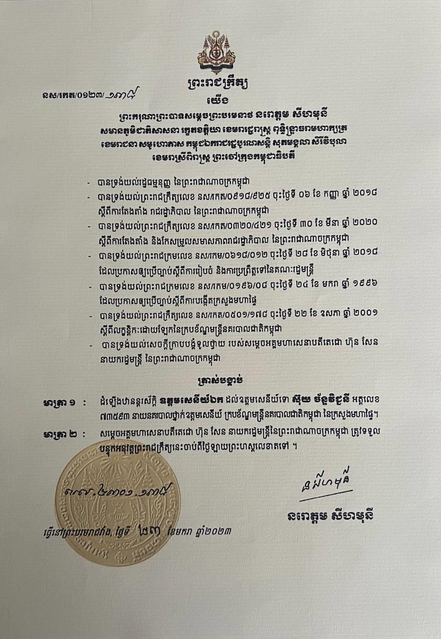 (ភ្នំពេញ)៖ ព្រះករុណា ព្រះបាទ សម្តេចព្រះ បរមនាថ នរោត្តម សីហមុនី ព្រះមហាក្សត្រនៃព្រះរាជាណាចក្រកម្ពុជា ចេញព្រះរាជក្រឹត្យត្រាស់បង្គាប់ដំឡើងឋានន្តរស័ក្តិថ្នាក់ឧត្តមសេនីយ៍ឯក (ផ្កាយ៣) ជូនឧត្តមសេនីយ៍ទោ ស៊ុយ ច័ន្ទវិជ្ជនី។ នេះបើតាមព្រះរាជក្រឹត្យដែលបណ្តាញព័ត៌មាន Fresh News ទទួលបាននៅថ្ងៃទី១៩ ខែមីនា ឆ្នាំ២០២៣។
