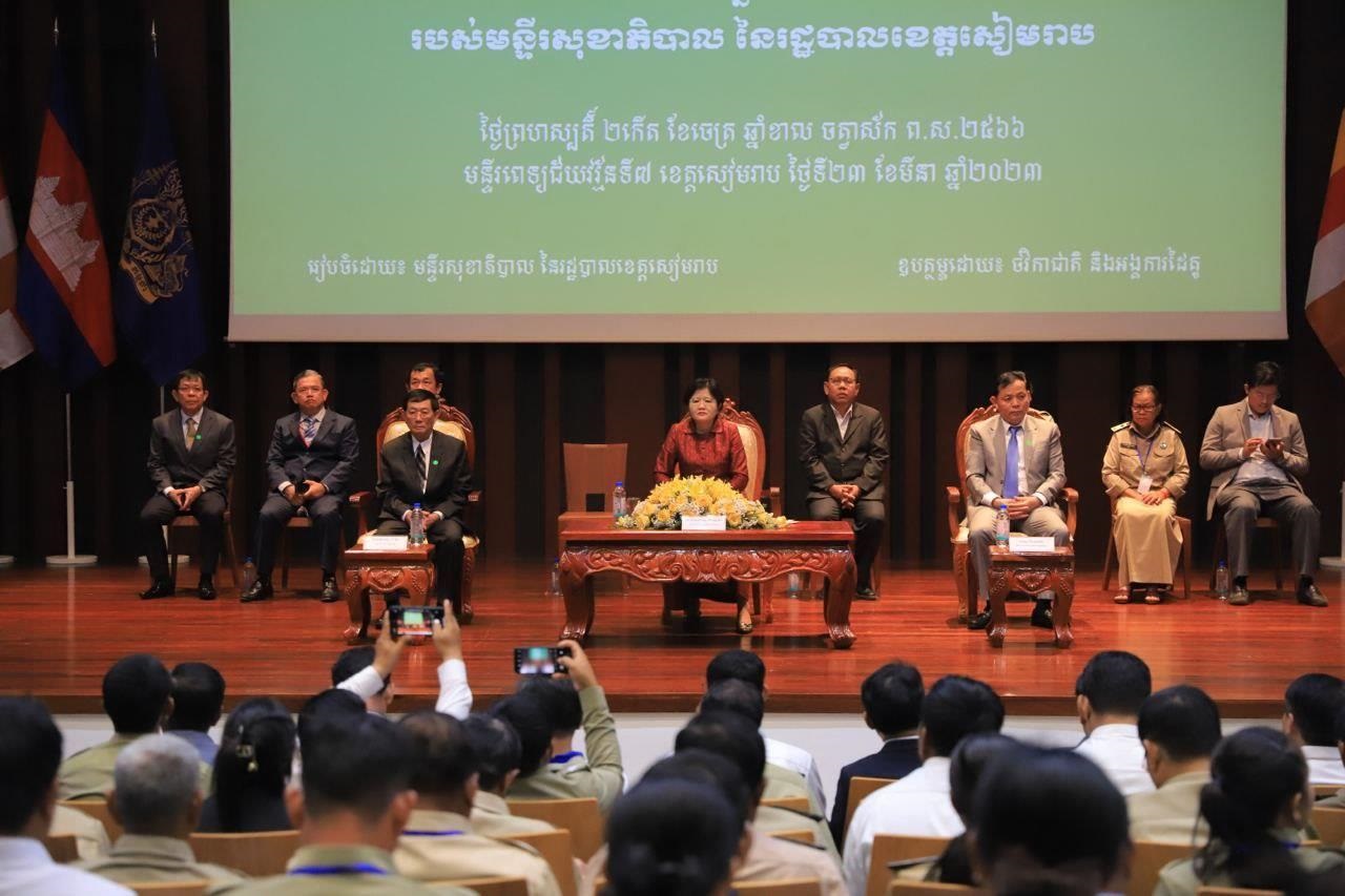 លោកវេជ្ជបណ្ឌិត បានបន្តថា ការអនុវត្តសកម្មភាពវិស័យសុខាភិបាល ក្នុងឆ្នាំ២០២២ ក្រោមការដឹកនាំ និងការទទួលខុសត្រូវរបស់មន្ទីរសុខាភិបាល នៃរដ្ឋបាលខេត្តសៀមរាប បានប្រព្រឹត្តទៅដោយរលូនទាំងការងារ គ្រប់គ្រងមន្ត្រីរាជការ ទាំងការផ្តល់សេវាសុខាភិបាលសាធារណៈនិងឯកជន ការងារទំនាក់ទំនងសហប្រតិបត្តិ ការពិសេសបញ្ហាប្រឈម និងភាពខ្វះខាត ទាំងឡាយត្រូវបានដោះស្រាយតាមរចនាសម្ព័ន្ធរួមមាន៖ ការិយាល័យមន្ទីរចំនួន០៤ ការិយាល័យសុខាភិបាល ស្រុកប្រតិបត្តិចំនួន០៤ អង្គភាពផ្តល់សេវាសុខភាព សាធារណៈក្នុងការពិនិត្យ ពិគ្រោះ ថែទាំ ព្យាបាលជម្ងឺ មានមន្ទីរពេទ្យបង្អែកខេត្តផ្តល់សេវាបង្គ្រប់កំរិត៣ ចំនួន០១កន្លែង មានមន្ទីរពេទ្យបង្អែកស្រុកចំនួន៤កន្លែងផ្តល់សេវាបង្គ្រប់កំរិត២ និងមណ្ឌលសុខភាព ចំនួន៩៤ ប៉ុស្តិ៍សុខភាពចំនួន០២កន្លែង ជាមួយនឹងគ្រែសម្រាកព្យាបាលជម្ងឺសរុបចំនួន៧០៣គ្រែ កំពុងផ្តល់សេវាព្យាបាល២៤ម៉ោងលើ២៤ម៉ោង ដល់អ្នកជំងឺមកពីគ្រប់មជ្ឈដ្ឋានដោយមិនប្រកាន់ពូជសាសន៍ និន្នាការនយោបាយឡើយ។
