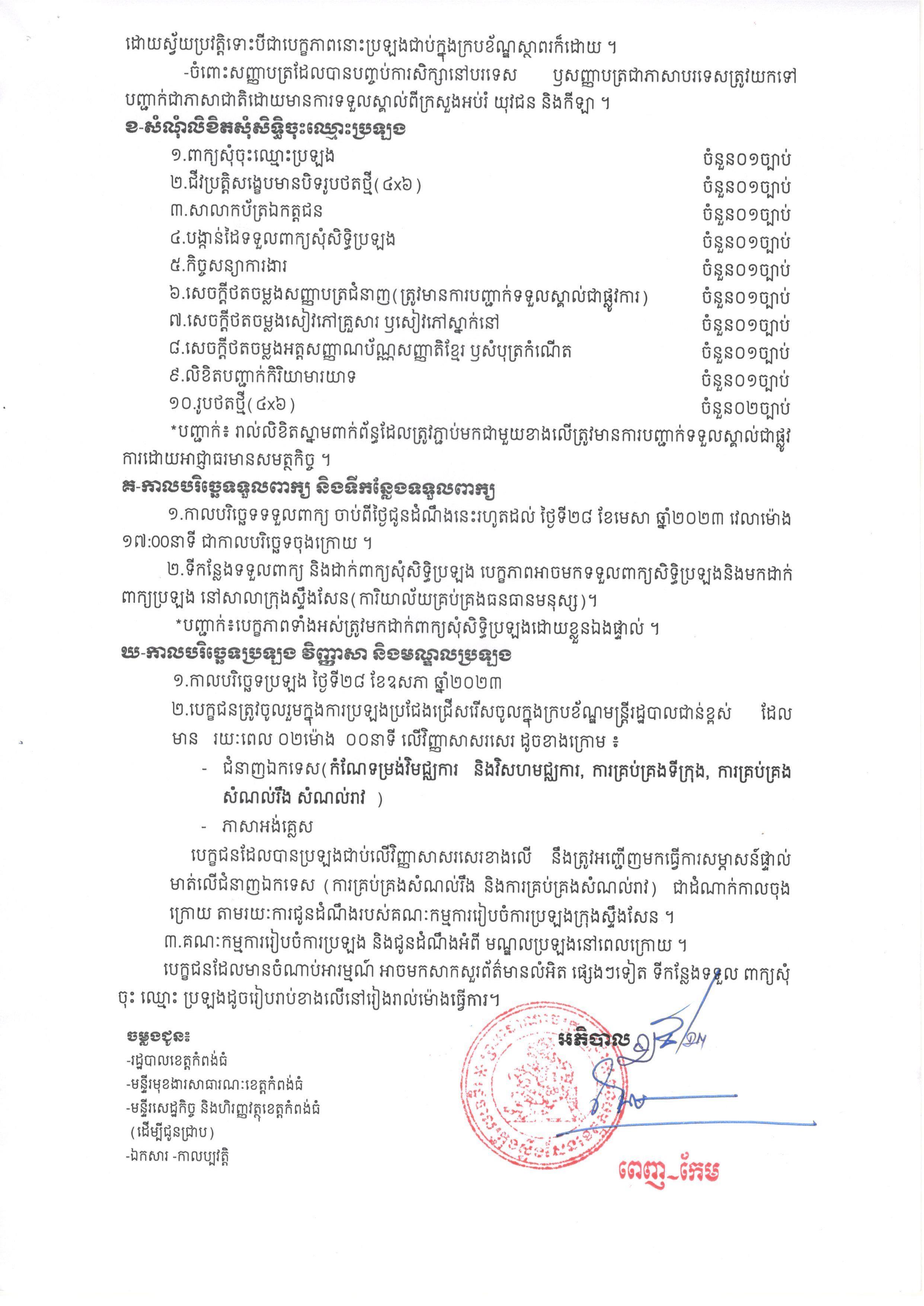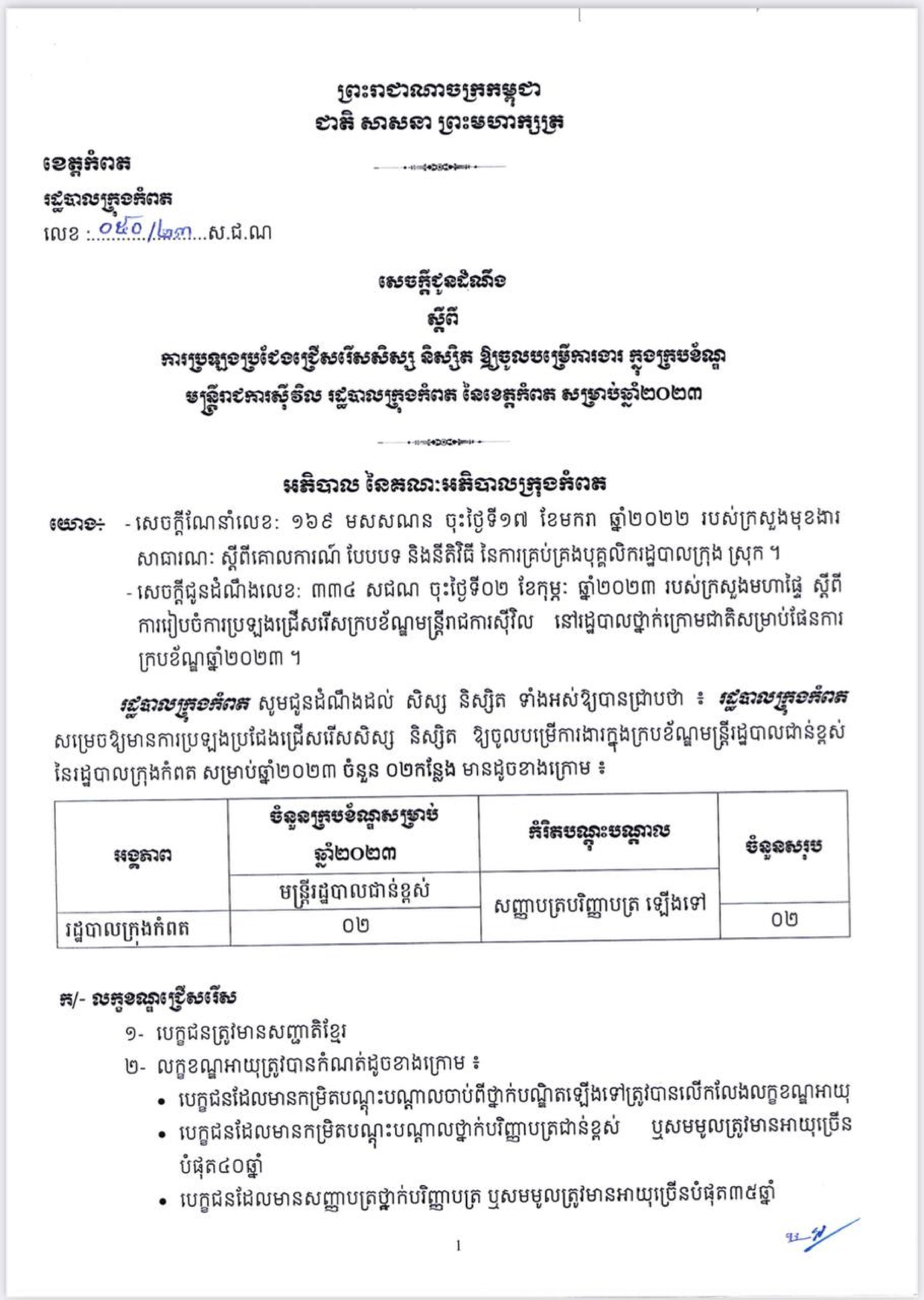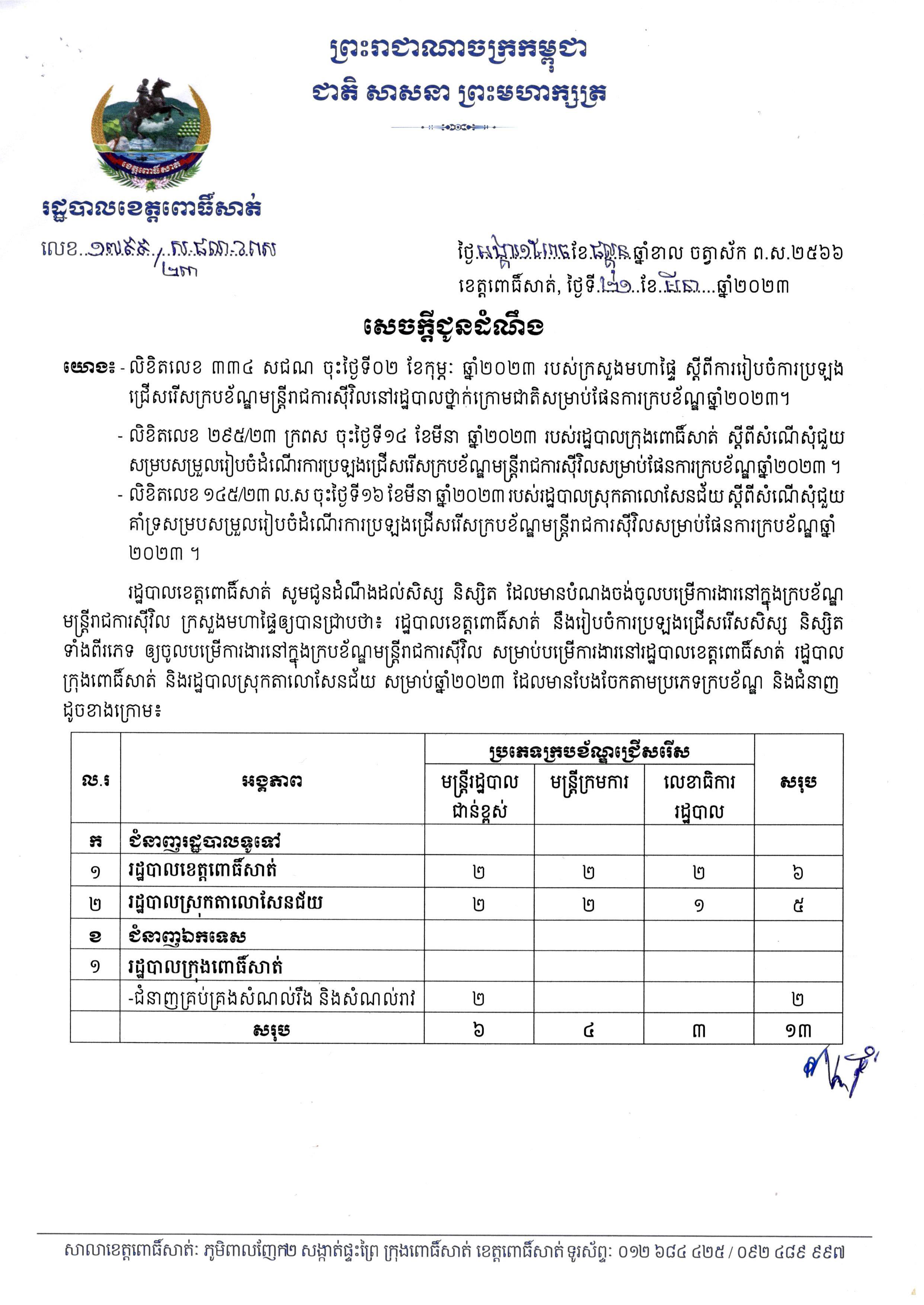 បេីតាមសេចក្ដីជូនដំណឹង, រដ្ឋបាលខេត្ត ក្រុង ស្រុក ត្រូវការអ្នកជំនាញគ្រប់គ្រងសំណល់រឹង និងសំណល់រាវ ចំនួន ១៤ នាក់ មកក្នុងក្របខ័ណ្ឌមន្រ្តីរដ្ឋបាលជាន់ខ្ពស់ ដូចខាងក្រោម៖