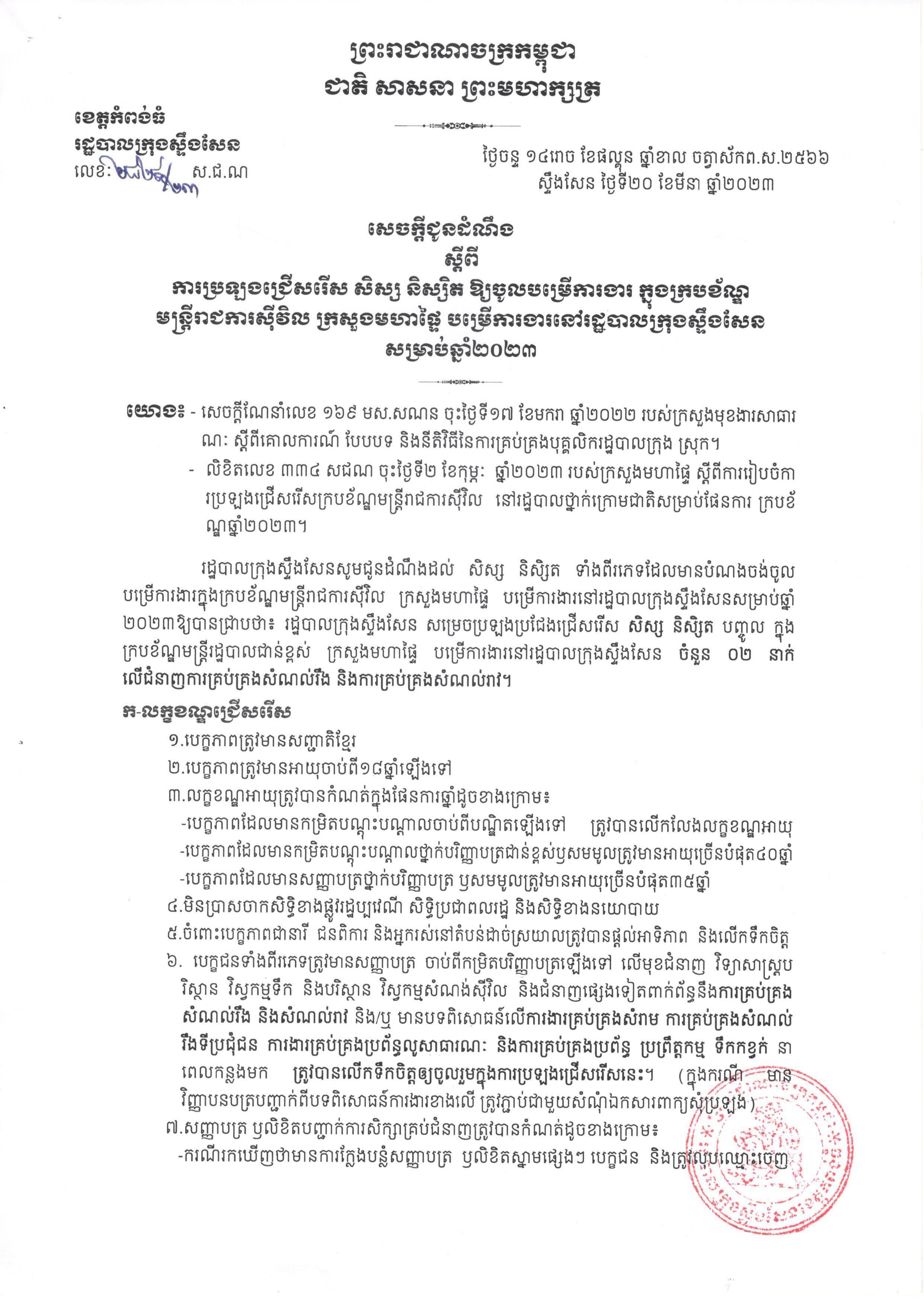 ជូនដំណឹង! ក្រសួងមហាផ្ទៃ ជ្រេីសរេីសមន្ដ្រីរដ្ឋបាលជាន់ខ្ពស់ តាមខេត្ដចំនួន៨ ពាក់ព័ន្ធនឹងជំនាញគ្រប់គ្រងសំណល់រឹង និងរាវ