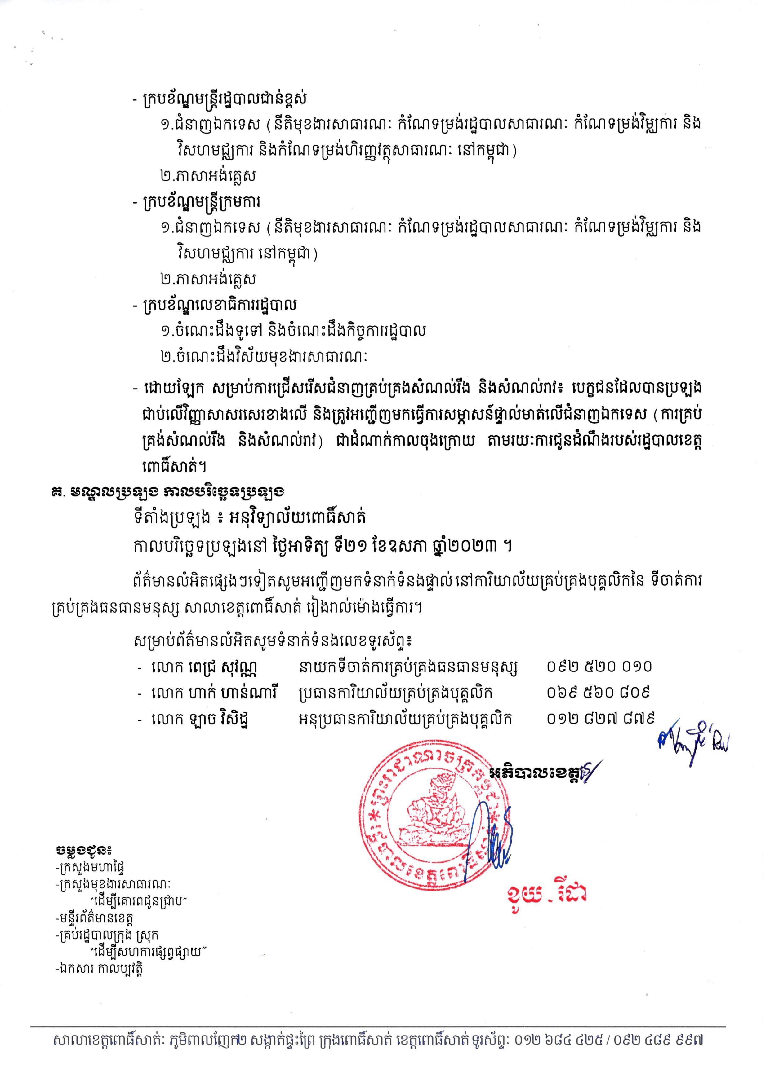 ៤. ជំនាញគ្រប់គ្រងសំណល់រឹង និងរាវ ចំនួន ០២ នាក់ (រដ្ឋបាលក្រុងពោធិ៍សាត់)