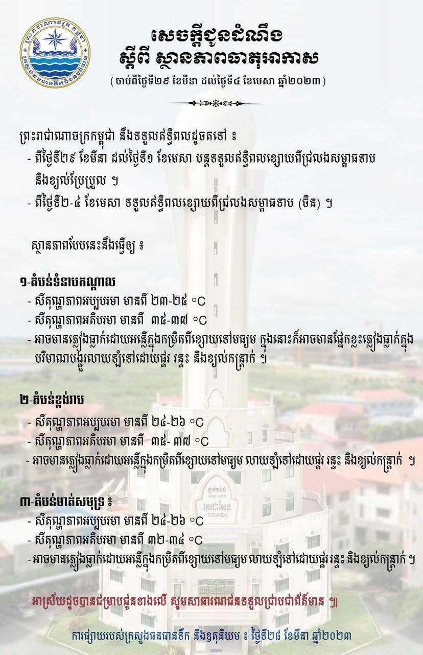 (ភ្នំពេញ)៖ ក្រសួងធនធានទឹក និងឧតុនិយម នៅព្រឹកថ្ងៃទី២៨ ខែមីនា ឆ្នាំ២០២៣នេះ បានចេញសេចក្តីជូនដំណឹង ស្តីពី ស្ថានភាពធាតុអាកាស ចាប់ពីថ្ងៃទី២៩ ខែមីនា ដល់ថ្ងៃទី៤ ខែមេសា ឆ្នាំ២០២៣។
