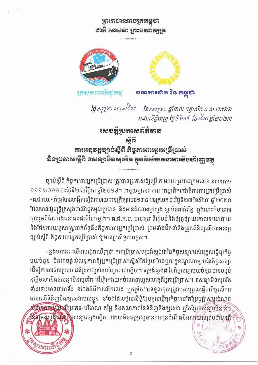 ក្រសួងពាណិជ្ជកម្ម និងធនាគារជាតិនៃកម្ពុជា សូមក្រើនរំលឹកដល់គ្រឹះស្ថានធនាគារ និងហិរញ្ញវត្ថុ អនុវត្តឱ្យបានត្រឹមត្រូវ ស្របតាមខ្លឹមសារនៃច្បាប់ស្តីពី កិច្ចការពារអ្នកប្រើប្រាស់ និងប្រកាសស្តីពីខសន្យាមិន សុចរិត ដើម្បីការពារសិទ្ធិអ្នកប្រើប្រាស់ និងជំរុញឱ្យការប្រកួតប្រជែងប្រកបដោយតម្លាភាព។