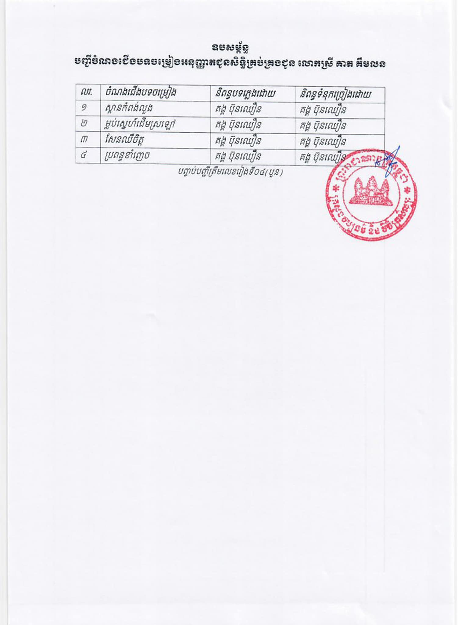 ក្រសួងវប្បធម៌ ប្រគល់សិទ្ធិជូនលោកស្រី គាត គឹមលន គ្រប់គ្រងបទចម្រៀងចំនួន៤បទ ដែលជាស្នាដៃនិពន្ធដោយលោក គង្គ ប៊ុនឈឿន