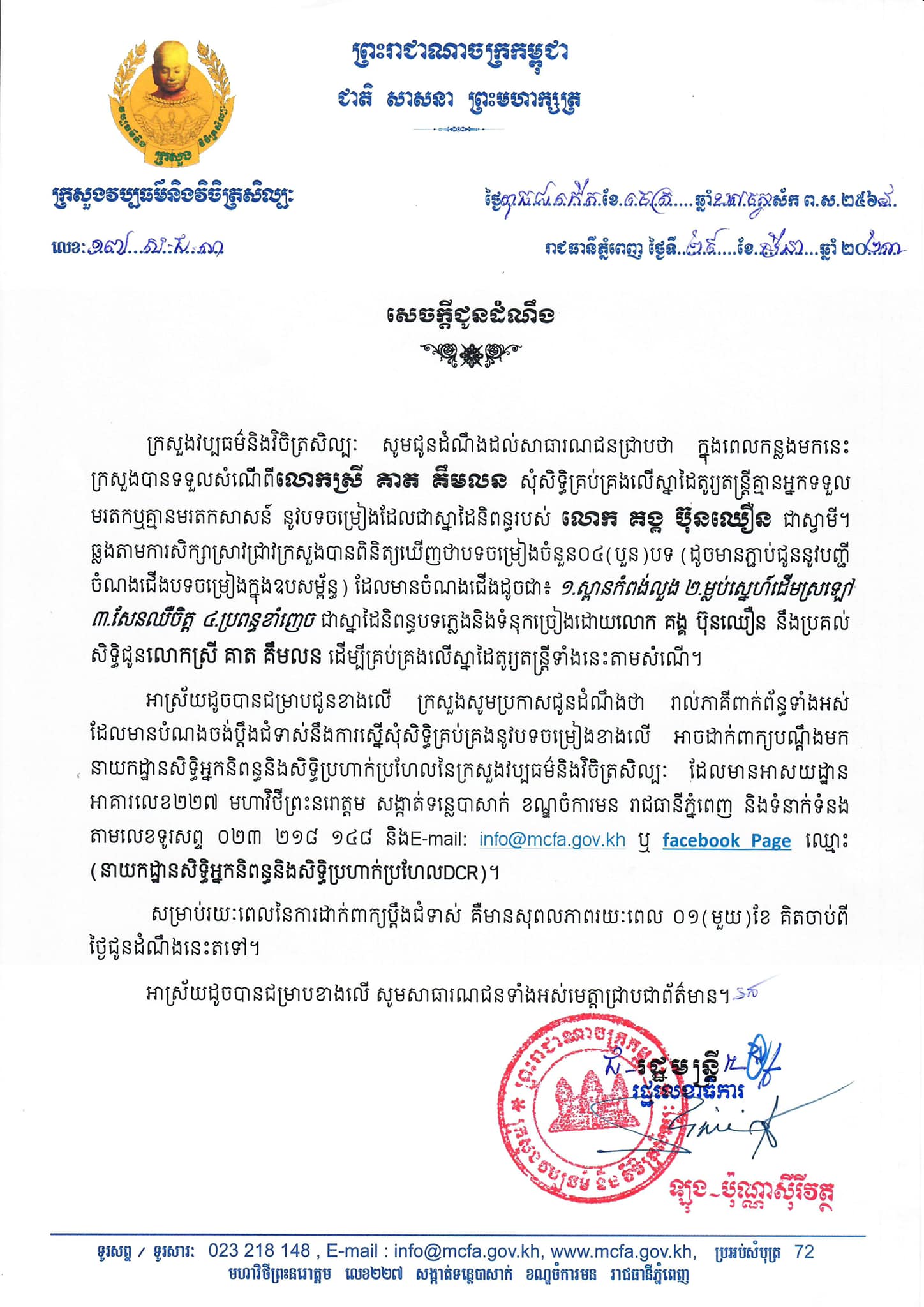 ក្រសួងបានឱ្យដឹងថា ក្នុងពេលកន្លងមកនេះ ក្រសួងបានទទួលសំណើពីលោកស្រី គាត គឹមលន សុំសិទ្ធិគ្រប់គ្រងលើស្នាដៃតូរ្យតន្ត្រីគ្មានអ្នកទទួល មរតកឬគ្មានមរតកសាសន៍ នូវបទចម្រៀងដែលជាស្នាដៃនិពន្ធរបស់ លោក គង្គ ប៊ុនឈឿន ជាស្វាមី។