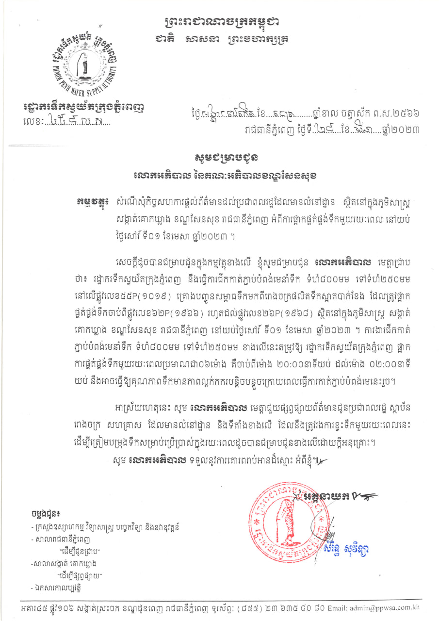 យោងតាមសេចក្តីជូនដំណឹងការផ្អាកការផ្គត់ផ្គង់នេះ គឺដើម្បីធ្វើការជីកកាត់ភ្ជាប់បំពង់មេនាំទឹក ទំហំ៨០០ម ទៅទំហំ២៥០មម នៅលើផ្លូវលេខ៥៥P(១០១៩) គ្រោងបញ្ជូនសម្ពាធទឹកមកពីរោងចក្រផលិតទឹកស្អាតបាក់ខែង ដែលត្រូវផ្អាកផ្គត់ផ្គង់ទឹកចាប់ពីផ្លូវលេខ៦២P(១៩៦៦) រហូតដល់ផ្លូវលេខ២៦P(១៩៦៨) ស្ថិតនៅក្នុងភូមិសាស្ត្រ សង្កាត់ គោកឃ្លាង ខណ្ឌសែនសុខ រាជធានីភ្នំពេញ នៅយប់ថ្ងៃសៅរ៍ ទី០១ ខែមេសា ឆ្នាំ២០២៣ ។