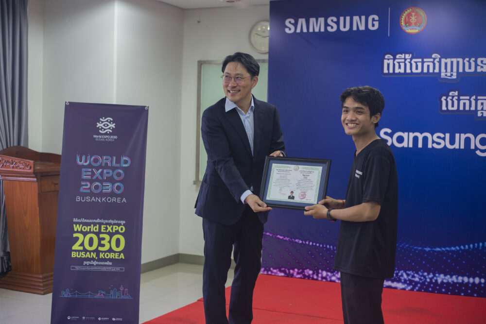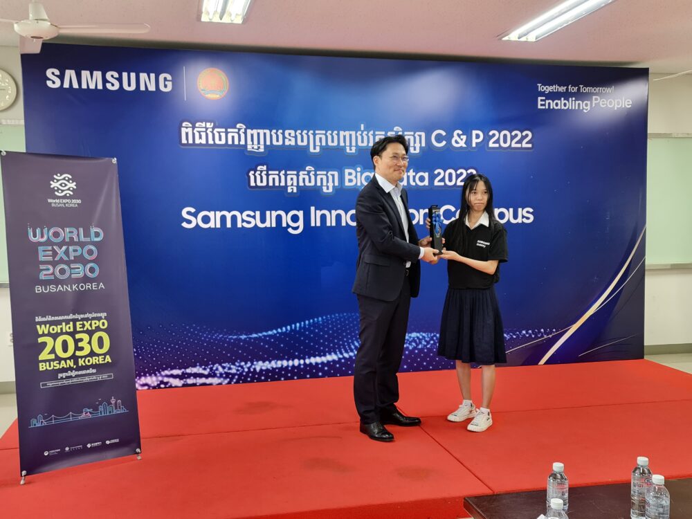 ស្របពេលនេះដែរ ក្រុមហ៊ុន សាមសុង ក៏បានធ្វើការប្រគល់ជូននូវរង្វាន់លើកទឹកចិត្តជូនដល់និសិ្សតឆ្នើមចំនួន 3 រូប ដែលទទួលបានចំណាត់ថ្នាក់ពិសេស៖