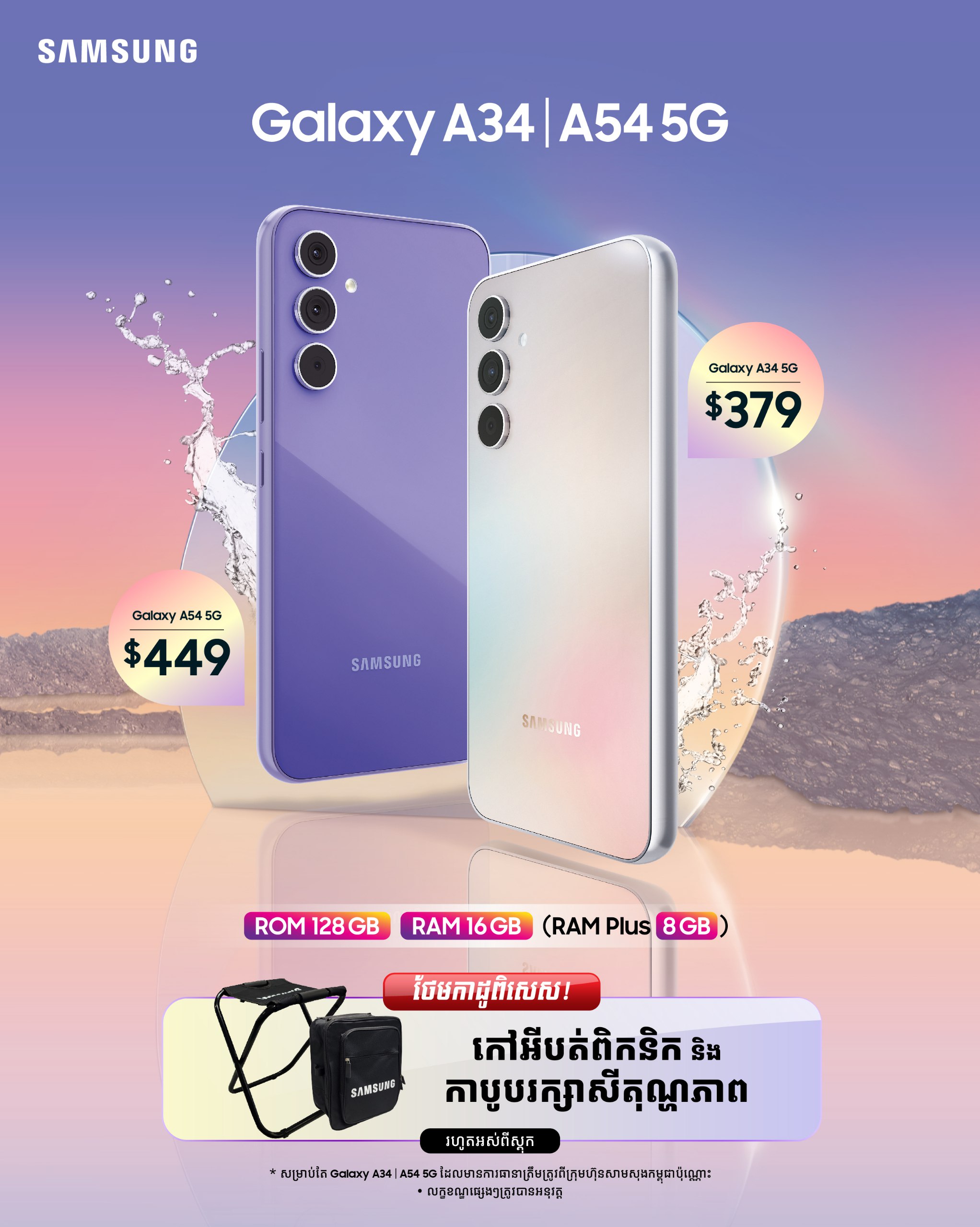 ជាក់ស្តែងថ្ងៃនេះក្រុមហ៊ុន សាមសុង បានផ្តល់នូវភាពភ្ញាក់ផ្អើលដោយនំាយកនូវស្មាតហ្វូន Samsung Galaxy A34 5G និង Galaxy A54 5G ជំនាន់ថ្មី ដែលទំនើបអស្ចារ្យជាមួយនឹងតម្លៃយ៉ាងពិសេសដែលសឹងតែមិនគួរឱ្យជឿមកលក់ជាផ្លូវការក្នុងប្រទេសកម្ពុជាយើង!