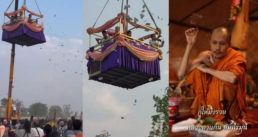 ព្រះសង្ឃថៃមួយអង្គ បាចលុយពីលើអាកាសច្រើនសន្ធឹកឱ្យពុទ្ធបរិស័ទ្ធ ក្នុងថ្ងៃចម្រើនព្រះជន្ម