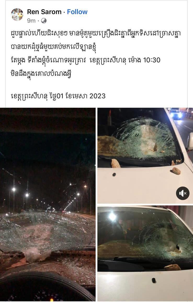 ស្នងការនគរបាលខេត្តព្រះសីហនុ លោកឧត្តមសេនីយ៍ទោ ជួន ណារិន្ទ បានប្រាប់បណ្ដាញព័ត៌មាន Fresh News ឲ្យដឹងនៅរសៀលថ្ងៃទី០៣ ខែមេសា ឆ្នាំ២០២៣នេះថា នៅវេលាកើតហេតុខាងលើ ជនសង្ស័យចំនួន២នាក់ ជិះម៉ូតូ១គ្រឿង បានប្រើដុំថ្មគប់ទៅលើរថយន្តមួយគ្រឿង ម៉ាក Lexus RX330 ពណ៌ស ក្នុងទិសដៅផ្ទុយគ្នា បណ្តាលឲ្យបែកកញ្ចក់ខាងមុខផ្នែកខាងឆ្វេង។
