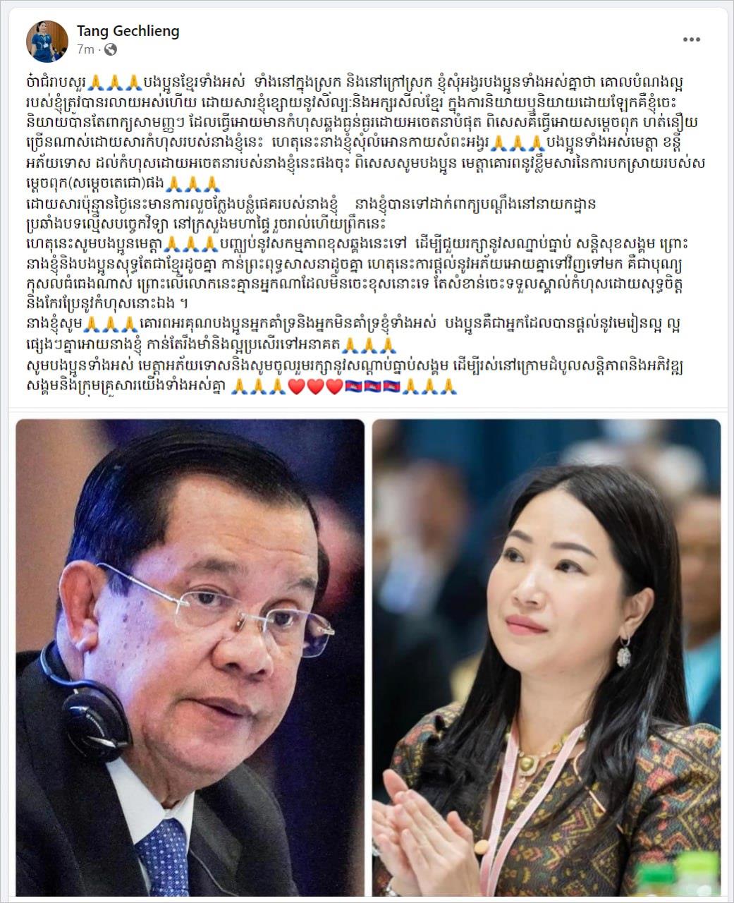 «ចា៎ជំរាបសួរ 🙏🙏🙏 បងប្អូនខ្មែរទាំងអស់ទាំងនៅក្នុងស្រុក និងនៅក្រៅស្រុក ខ្ញុំសុំអង្វរបងប្អូនទាំងអស់គ្នាថា គោលបំណងល្អរបស់ខ្ញុំត្រូវបានរលាយអស់ហេីយ ដោយសារខ្ញុំខ្សោយនូវសិល្ប: និងអក្សរសាស្ត្រខ្មែរ ក្នុងការនិយាយឬនិយាយដោយឡែក គឺខ្ញុំចេះនិយាយបានតែពាក្យសាមញ្ញៗ ដែលធ្វេីឱ្យមានកំហុសឆ្គងធ្ងន់ធ្ងរដោយអចេតនាបំផុត ពិសេសគឺធ្វេីអោយសម្តេចពុក ហត់នឿយ ច្រេីនណាស់ដោយសារកំហុសរបស់នាងខ្ញុំនេះ ហេតុនេះនាងខ្ញុំសុំលំអោនកាយសំពះអង្វរ 🙏🙏🙏 បងប្អូនទាំងអស់មេត្តា ខន្តីអភ័យទោស ដល់កំហុសដោយអចេតនារបស់នាងខ្ញុំនេះផងចុះ ពិសេសសូមបងប្អូន មេត្តាគោរពនូវខ្លឹមសារនៃការបកស្រាយរបស់សម្តេចពុក (សម្តេចតេជោ)ផង🙏🙏🙏