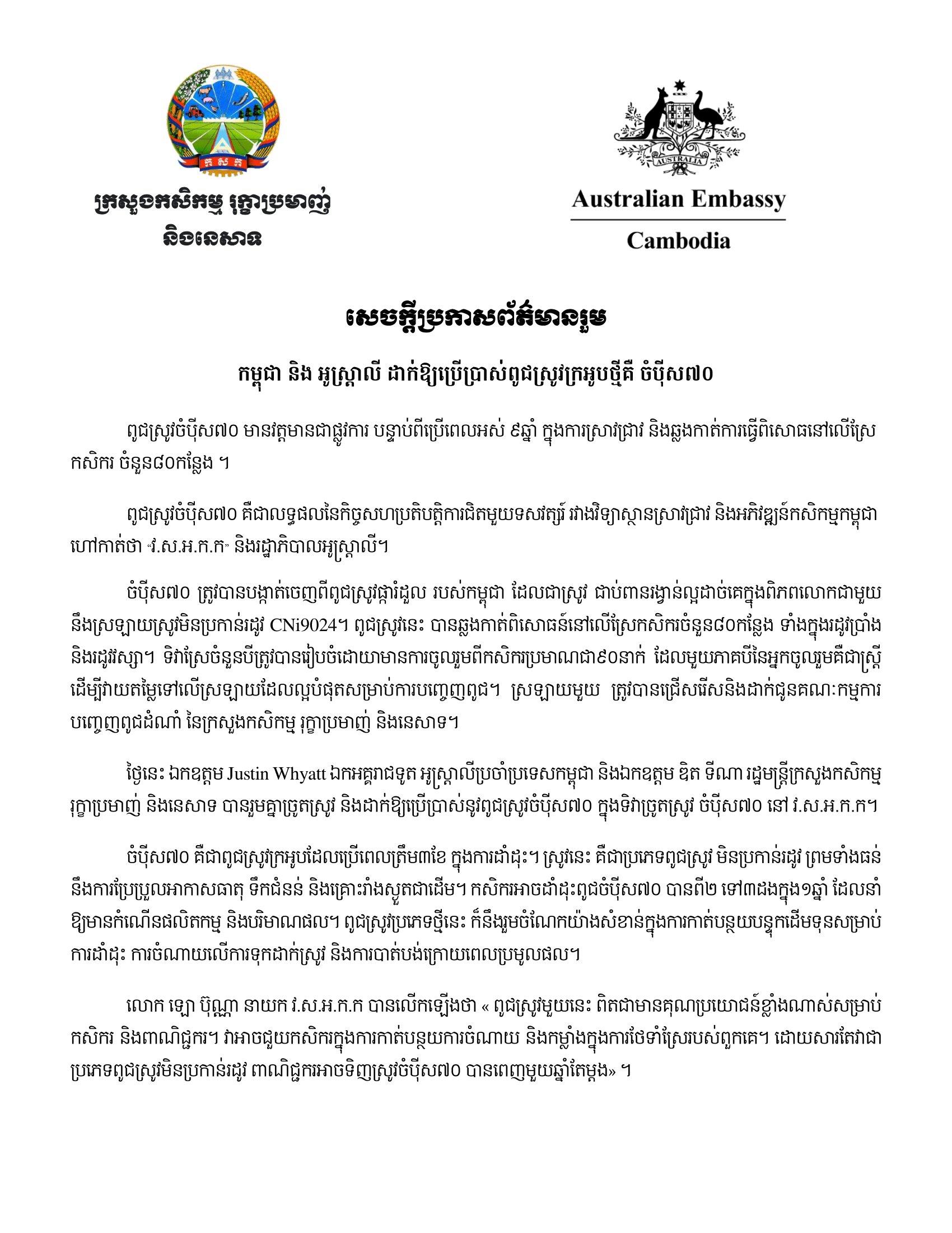 ថ្ងៃនេះ លោក Justin Whyatt ឯកអគ្គរាជទូត អូស្ត្រាលីប្រចាំប្រទេសកម្ពុជា និងលោក ឌិត ទីណា រដ្ឋមន្ត្រីក្រសួងកសិកម្ម រុក្ខាប្រមាញ់ និងនេសាទ បានរួមគ្នាច្រូតស្រូវ និងដាក់ឱ្យប្រើប្រាស់នូវពូជស្រូវចំប៉ីស៧០ ក្នុងទិវាច្រូតស្រូវ ចំប៉ីស៧០ នៅ CARDI។