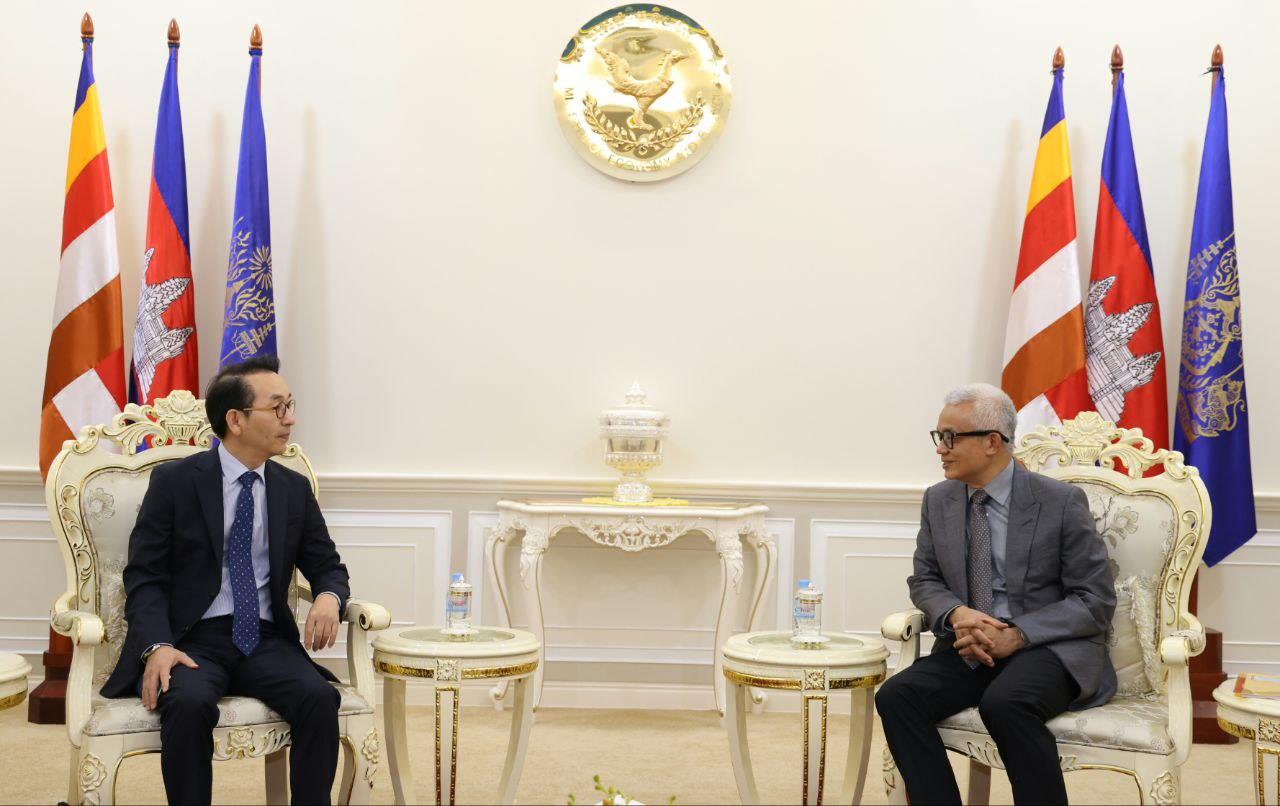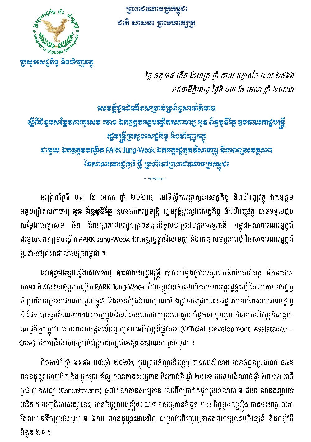 (ភ្នំពេញ)៖ អគ្គបណ្ឌិតសភាចារ្យ អូន ព័ន្ធមុនីរ័ត្ន ឧបនាយករដ្ឋមន្ត្រី រដ្ឋមន្ត្រីក្រសួងសេដ្ឋកិច្ច និងហិរញ្ញវត្ថុ បានទទួលជួបពិភាក្សាការងារក្នុងក្របខណ្ឌកិច្ចសហប្រតិបត្តិការទ្វេភាគី កម្ពុជា-សាធារណរដ្ឋកូរ៉េ ជាមួយលោកបណ្ឌិត PARK Jung-Wook ឯកអគ្គរដ្ឋទូតវិសាមញ្ញ និងពេញសមត្ថភាពថ្មី នៃសាធារណរដ្ឋកូរ៉េ នាថ្ងៃទី៤ ខែមេសា ឆ្នាំ២០២៣នេះ។