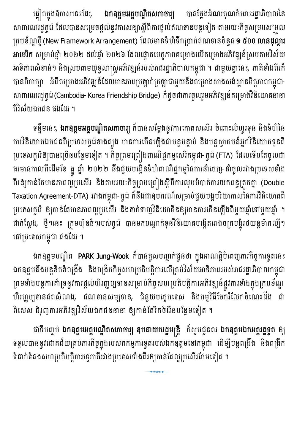 ក្នុងជំនួបនេះ អគ្គបណ្ឌិតសភាចារ្យ បានសម្តែងនូវការស្វាគមន៍យ៉ាងកក់ក្តៅ និងអបអរសាទរ ចំពោះលោកបណ្ឌិត PARK Jung-Wook ដែលត្រូវបានតែងតាំងជាឯកអគ្គរដ្ឋទូតថ្មី នៃសាធារណរដ្ឋកូរ៉េ ប្រចាំនៅកម្ពុជា និងបន្តស្វាគមន៍អ្នកវិនិយោគទុនពីប្រទេសកូរ៉េឲ្យបានច្រើនបន្ថែមទៀត ខណៈចំពោះលំហូរទុន និងទំហំនៃការវិនិយោគឯកជនពីប្រទេសកូរ៉េខាងត្បូង មានការកើនឡើងជាបន្តបន្ទាប់។