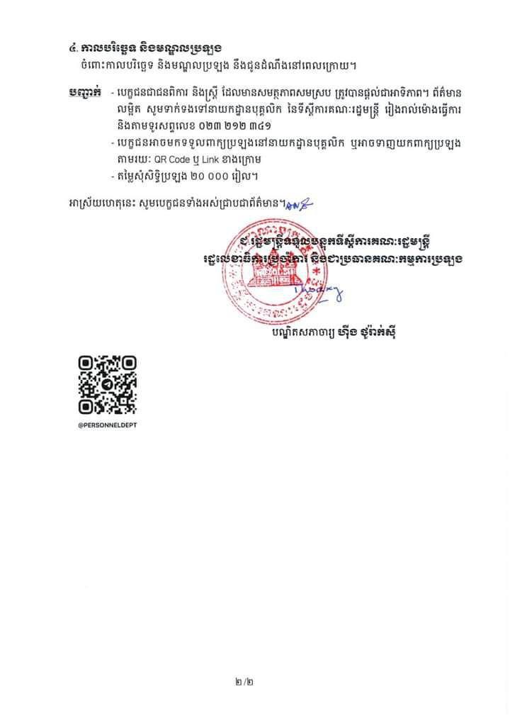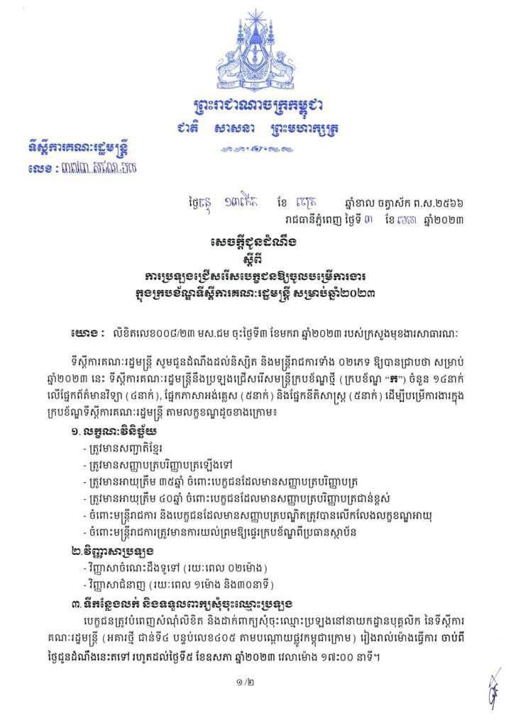 (ភ្នំពេញ)៖ ទីស្តីការគណៈរដ្ឋមន្ត្រី បានប្រកាសពីការប្រលងជ្រើសរើសមន្ត្រី ឲ្យចូលបម្រើការងារក្របខណ្ឌទីស្តីការគណៈរដ្ឋមន្ត្រី ចំនួន ១៤រូប សម្រាប់ឆ្នាំ២០២៣នេះ។ នេះបើតាមសេចក្តីជូនដំណឹង ដែលបណ្តាញ Fresh News ទទួលបាននៅថ្ងៃទី៤​ ខែមេសា ឆ្នាំ២០២៣។