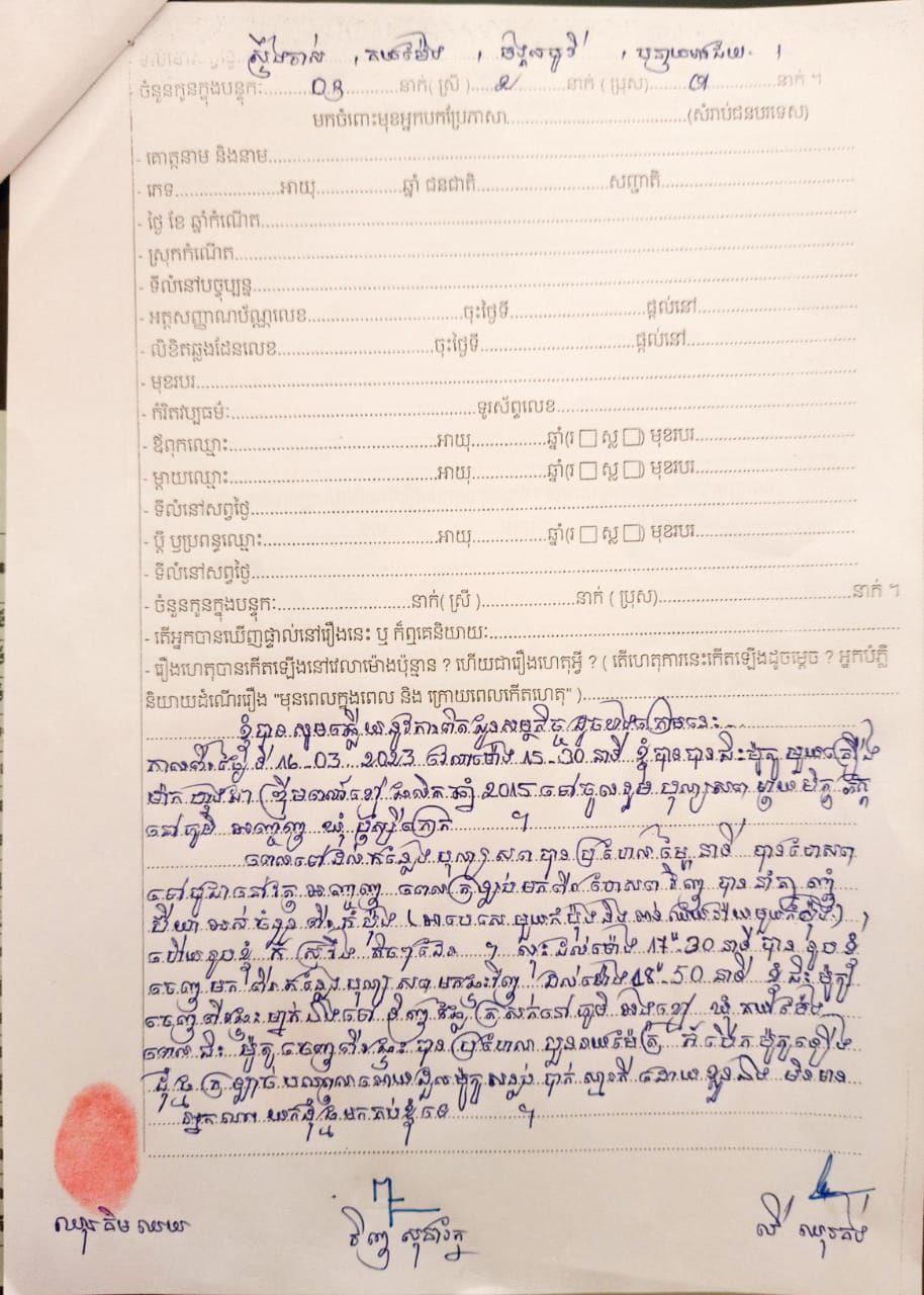 តាមការបំភ្លឺជនរងគ្រោះ គាត់បាននិយាយថា នៅថ្ងៃកើតហេតុនោះ គាត់មកពីបុណ្យសពគេ ហើយស្រវឹងស្រាស្រឺងៗត្រឡប់ទៅផ្ទះវិញ។ បន្ទាប់មកក៏ទៅទិញផ្លែត្រសក់នៅភូមិអង្កខ្មៅ ឃុំ គយម៉ែង (ផ្លូវទៅភូមិស្រមោច) ស្រាប់ជិះម៉ូតូបានប្រហែល៤០០ម៉ែត្រ ខាងកើតផ្ទះក៏ជាន់ដុំថ្មក្រឡាច់ដួលបណ្តាលឲ្យគាត់សន្លប់ ត្រូវបានក្រុមគ្រួសារយកទៅព្យាបាលនៅមន្ទីរពេទ្យបង្អែកមិត្តភាពកម្ពុជា-ជប៉ុន ស្រុកមង្គលបូរី។