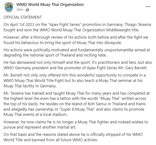 ស្ថាប័នម៉ឺយថៃពិភពលោក (WMO) បានចោទថា សកម្មភាពរបស់កីឡាករប្រដាល់ Thiago Teixeira បានបម្រើឱ្យនយោបាយ បង្អាប់កីឡាជាតិថៃ និងញុះញង់ឱ្យមានការស្អប់គ្នា ហើយថា វាគឺជាទង្វើមិនសមរម្យនោះឡើយ។ ពួកគេបាននិយាយថា Thiago Teixeira មិនត្រឹមតែប្រមាថខ្លួនគាត់ និងកីឡាប៉ុណ្ណោះទេ គាត់ថែមទាំងមិនគោរពដល់លោក Gary Barrett ដែលជាប្រធាន WMO នៅអាល្លឺម៉ង់ និងជាអ្នកលើកស្ទួយដល់ Apex Fight Series។