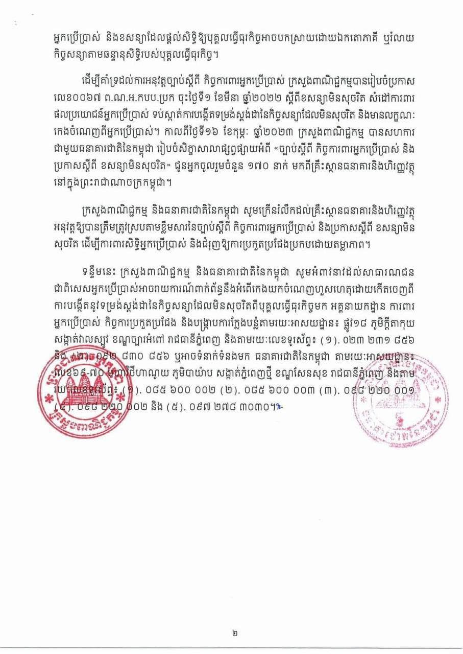 ដូចគ្នាអតិថិជនសូមពិនិត្យមើលកិច្ចសន្យារបស់ខ្លួន ឲ្យបានម៉ត់ចត់មុននឹងចុះហត្ថលេខា ហើយត្រូវយល់ពីសិទ្ធ និងកាតព្វកិច្ចខ្លួនឯងឲបានច្បាស់លាស់ ដើម្បីជៀសវាងជម្លោះនាថ្ងៃក្រោយ»។