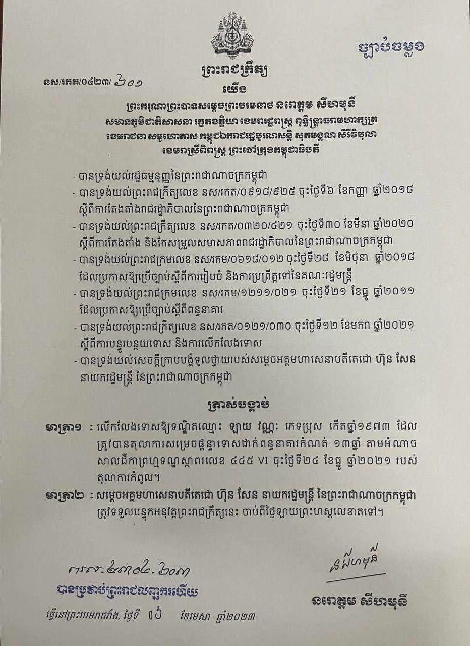 ព្រះមហាក្សត្រ ចេញព្រះរាជក្រឹត្យលើកលែងទោសឲ្យលោក ឡាយ វណ្ណៈ អតីតអភិបាលខេត្តតាកែវ