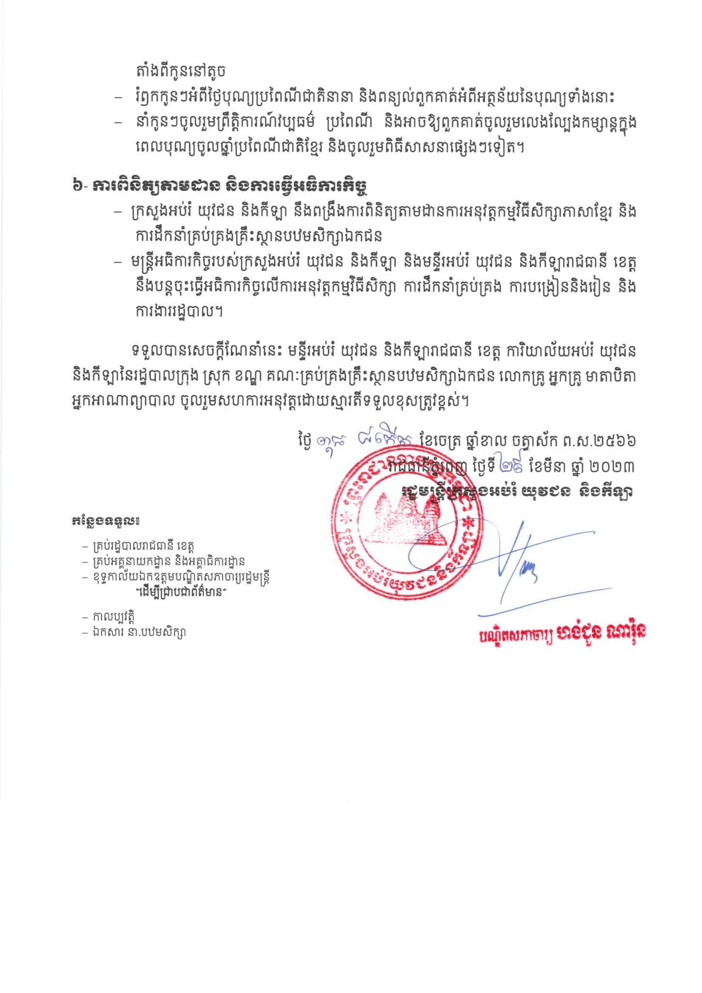 (ភ្នំពេញ)៖ ក្រសួងអប់រំ យុវជន និងកីឡា នៅថ្ងៃទី០៧ ខែមេសា ឆ្នាំ២០២៣ ចេញសេចក្ដីណែនាំ ស្ដីពីការពង្រឹងការអនុវត្តកម្មវិធីមុខវិជ្ជាភាសាខ្មែរ និងការបញ្ជ្រាបវប្បធម៌ អរិយធម៌ខ្មែរក្នុងម៉ោងសិក្សានៅតាមគ្រឹះស្ថានបឋមសិក្សាឯកជន ពីថ្នាក់ទី១ ដល់ថ្នាក់ទី៦។