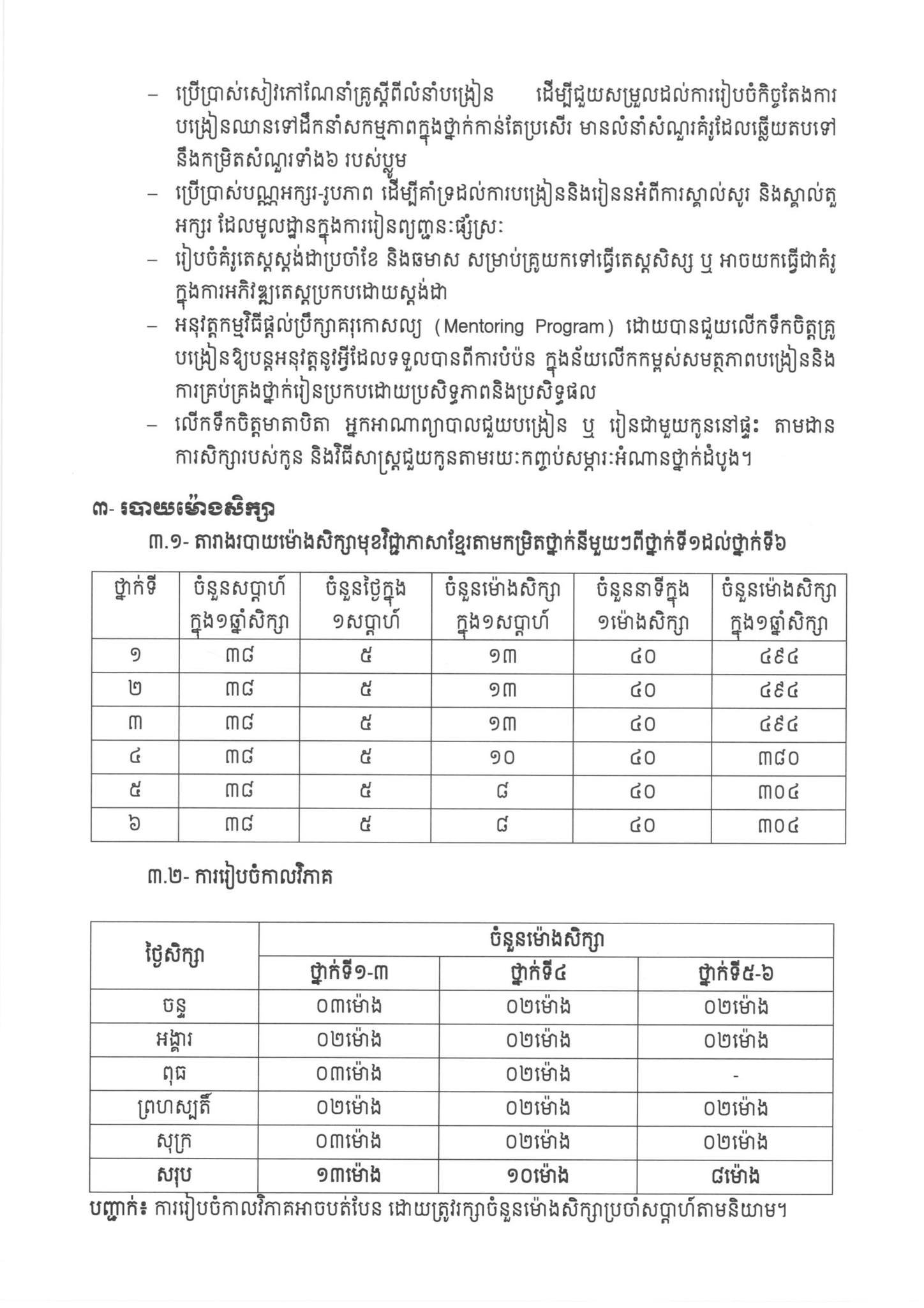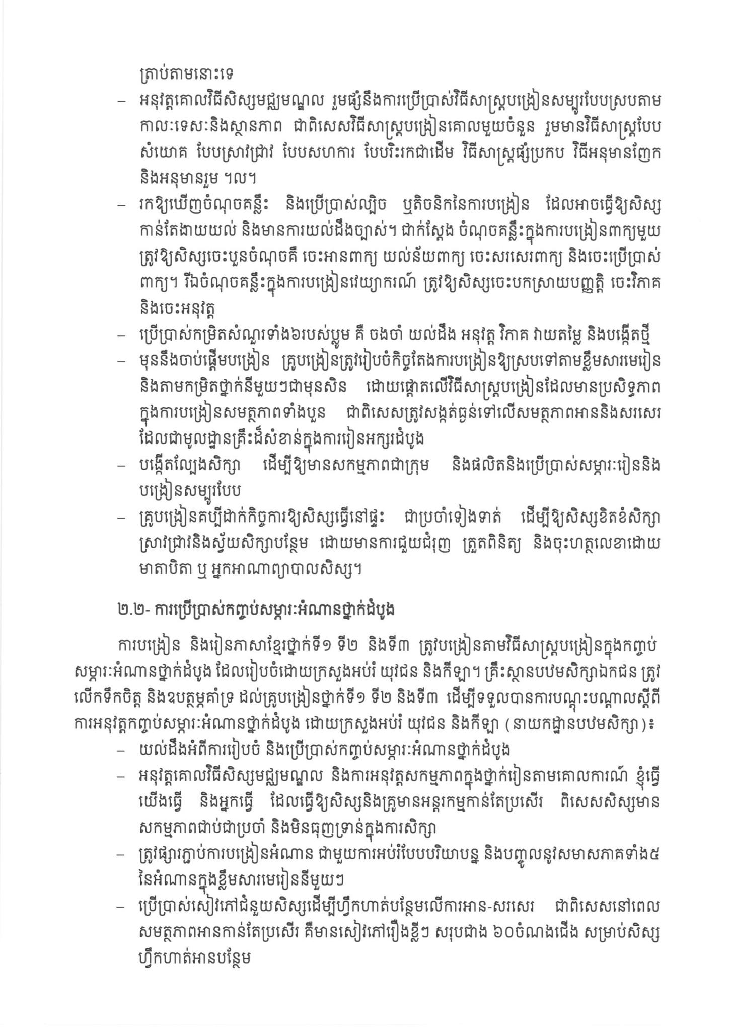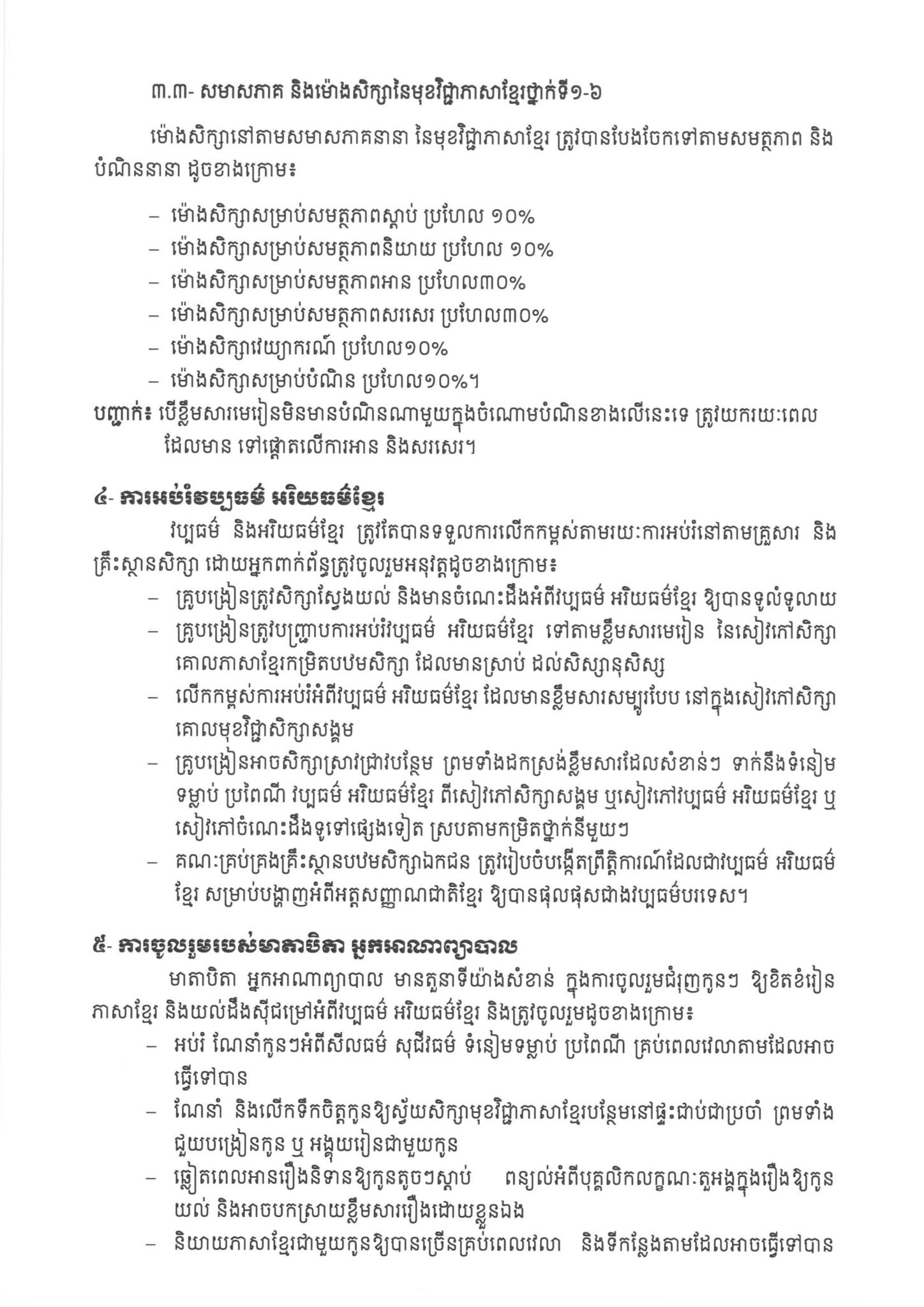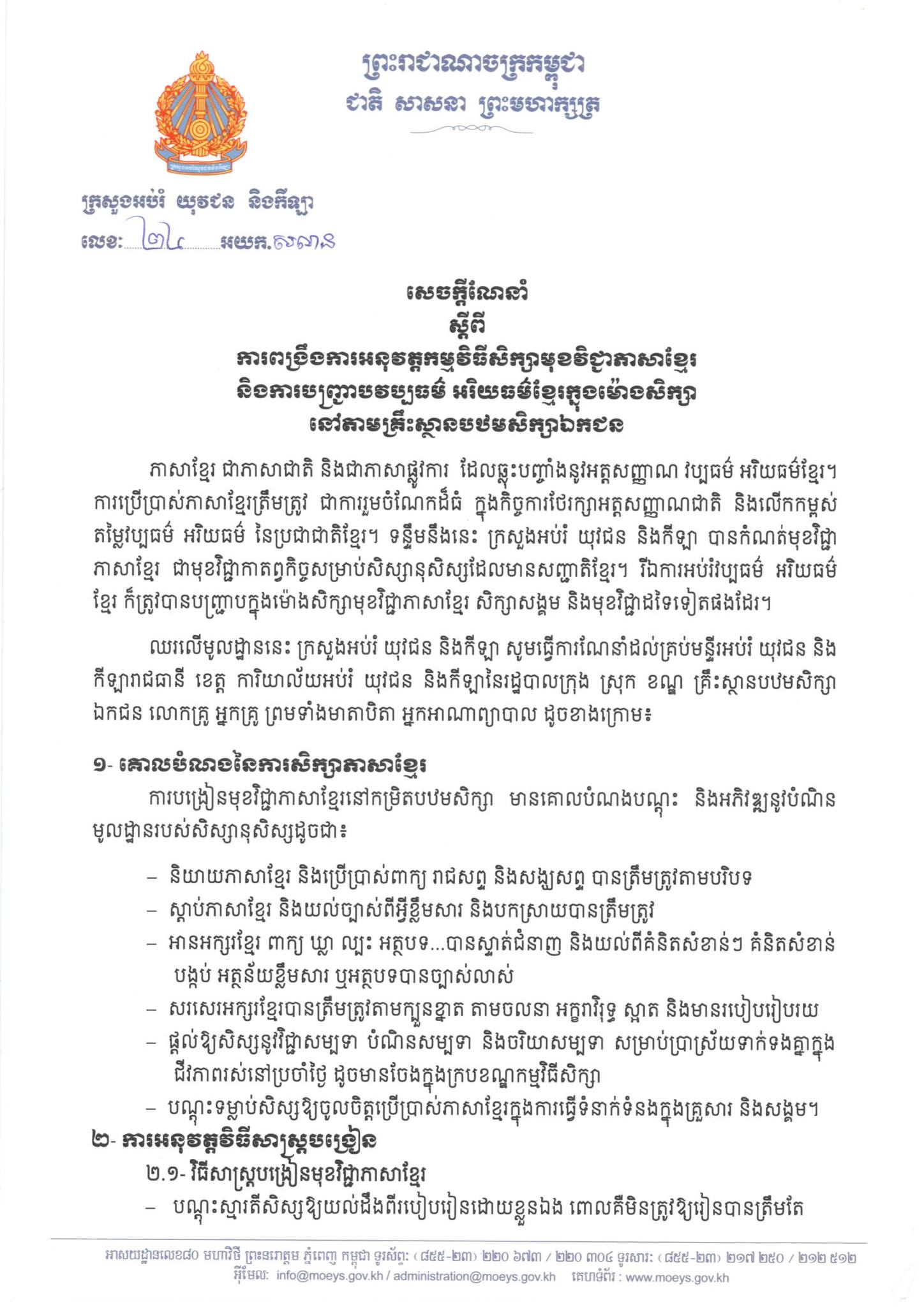 ក្រសួងអប់រំ ចេញសេចក្តីណែនាំពង្រឹងការអនុវត្តកម្មវិធីមុខវិជ្ជាភាសាខ្មែរ និងការបញ្ជ្រាបវប្បធម៌ អរិយធម៌ខ្មែរក្នុងម៉ោងសិក្សានៅតាមគ្រឹះស្ថានបឋមសិក្សាឯកជន