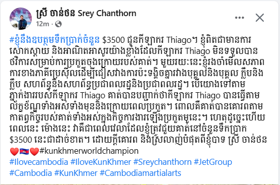 ឧកញ៉ា ស្រី ចាន់ថន បានបន្ថែមថា៖ «បើយោងទៅតាមភ្នាក់ងាររបស់កីឡាករ Thiago គាត់បានបញ្ជាក់ថាកីឡាករ Thiago បានធ្វើតាមល័ក្ខខ័ណ្ឌទាំងអស់ទាំងមុននិងក្រោយពេលប្រកួត។ ពោលគឺគាត់បានគោរពតាមកាតព្វកិច្ចរបស់គាត់ទាំងអស់ក្នុងកិច្ចការងារឡើងប្រកួតមួយនេះ។ ហេតុដូច្នេះហើយពេលនេះ ម៉ោងនេះ វាគឺជាពេលវេលាដែលខ្ញុំត្រូវជួយគាត់នៅចំនួនទឹកប្រាក់ ៣៥០០ដុល្លារ នេះជាដាច់ខាត។ ដោយក្តីគោរព និងស្រលាញ់បំផុតពីខ្ញុំបាទ ស្រី ចាន់ថន ៕ » ប្រភព៖ ស្រី ចាន់ថន Srey Chanthorn