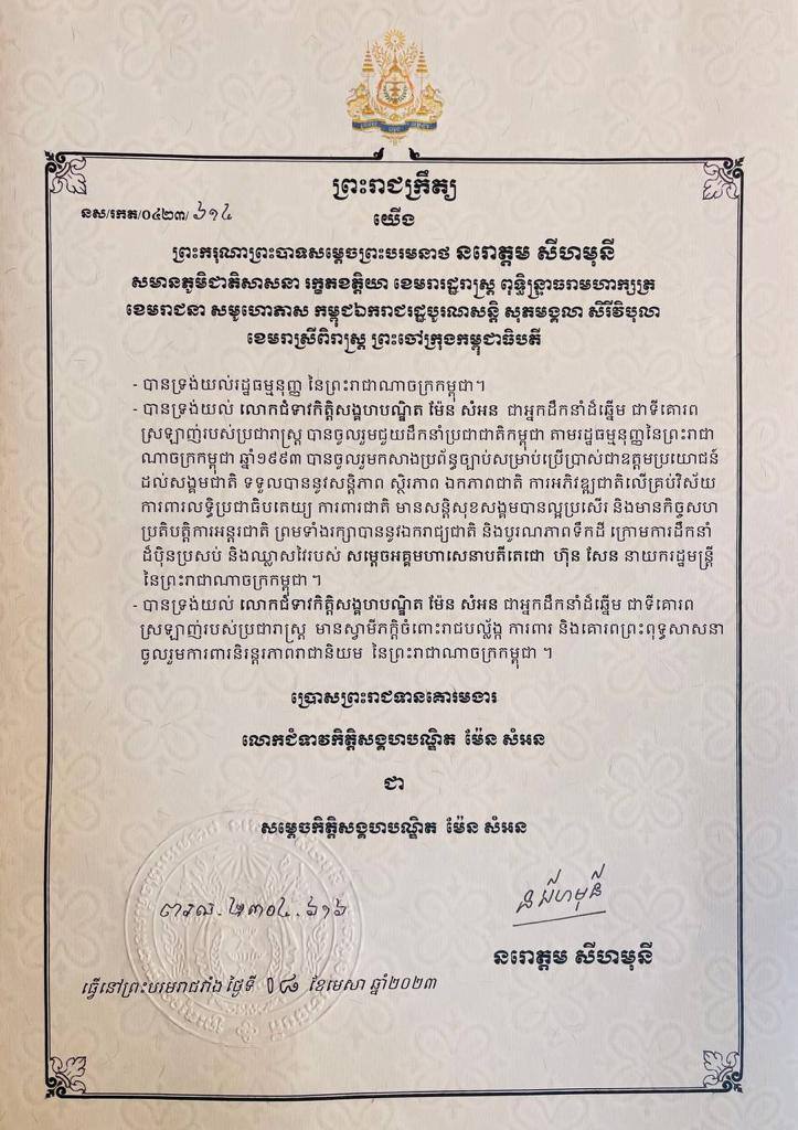 ព្រះមហាក្សត្រ ចេញព្រះរាជក្រឹត្យប្រទានគោរមងា «សម្ដេច» ជូនលោកជំទាវកិត្តិសង្គហបណ្ឌិត ម៉ែន សំអន
