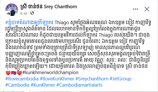 នៅក្នុងគណនីហ្វេសប៊ុករបស់ ឧកញ៉ា ស្រី ចាន់ថន បានសរសេររៀបរ៉ាប់យ៉ាងដូច្នេះថា៖ «ខ្ញុំបាទតំណាងឲ្យកីឡាករ Thiago សូមថ្លែងអំណរគុណ ឯកឧត្តម ខៀវ កាញារីទ្ធ រដ្ឋមន្រ្តីក្រសួងព័ត៌មាន ដែលលោកមានទឹកចិត្តល្អក្រៃលែងក្នុងការណាត់ជួបសំណេះសំណាល ក៏ដូចជាឧបត្ថមថវិកាដល់កីឡាករ Thiago របស់យើង។ ជាចុងក្រោយខ្ញុំសូមគោរពជូនពរបវរមហាប្រសើរ ជូនចំពោះ ឯកឧត្តម ខៀវ កាញារីទ្ធ និងលោកជំទាវ ព្រមទាំងបុត្រាបុត្រីជាទីស្រឡាញ់ មានសុខភាពល្អបរិបូរណ៍ បញ្ញាញាណភ្លឺថ្លាត្រចះត្រចង់ ជន្មាយុយឺនយូរ សេចក្តីសុខសុភមង្គលគ្រប់ទិវារាត្រី និងសូមប្រកបតែនឹងពុទ្ធពរទាំងបួនប្រការគឺ អាយុ វណ្ណៈ សុខៈ ពលៈ ជានិច្ចនិរន្តរ៍កុំបីឃ្លៀងឃ្លាតឡើយ។ ដោយក្តីគោរព និងស្រលាញ់បំផុតពីខ្ញុំបាទ ស្រី ចាន់ថន » ៕