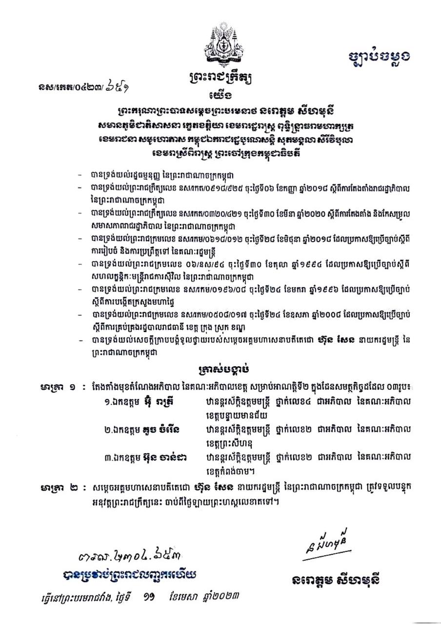 ក្នុងព្រះរាជក្រឹត្យដែលបណ្ដាញព័ត៌មាន Fresh News ទទួលបាននៅថ្ងៃទី១១ ខែមេសា ឆ្នាំ២០២៣នេះ បានឲ្យដឹងថា អភិបាលខេត្ដចំនួន៣រូប ដែលត្រូវបានតែងតាំង សម្រាប់អាណត្តិទី២ នោះរួមមាន៖