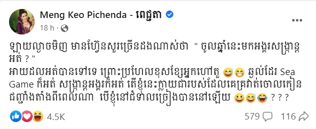 (ភ្នំពេញ)៖ តារាចម្រៀង អ្នកនាង ម៉េង កែវពេជ្ជតា បានចោទជាសំណួរឆ្ងល់ថា ដោយអ្នកនាងនៅបង្ហើរសំនៀងបាន ប៉ុន្តែបែរជានៅឆ្នាំ២០២៣ដែលព្រឹត្តិការណ៍ថ្នាក់ជាតិធំៗដូចជាអង្គរសង្ក្រាន្ត និងសុីហ្គេម បែរជាមិនមានវត្តមានរបស់ខ្លួនសម្តែងទៅវិញ។