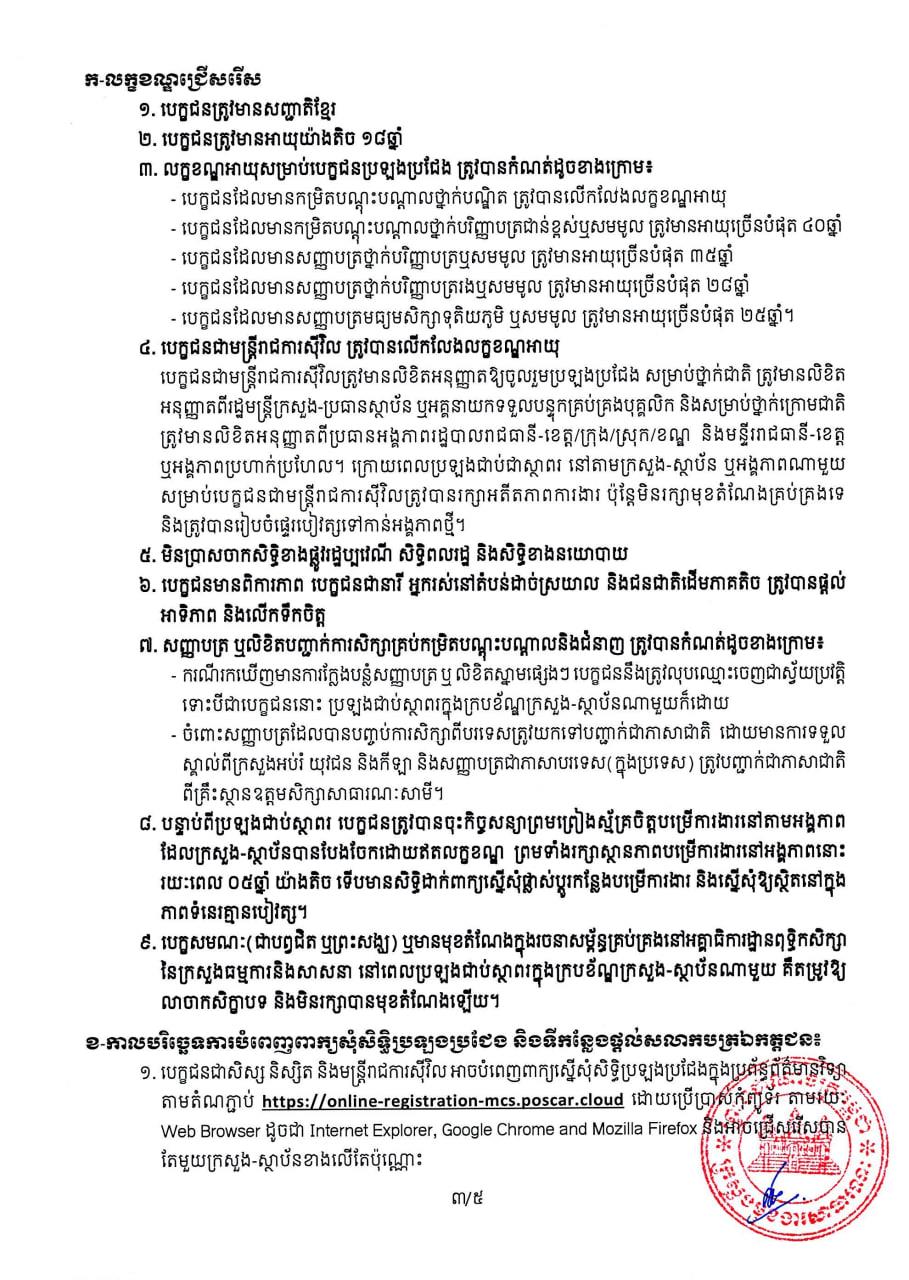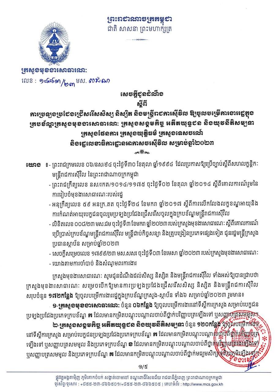 ក្រសួង-ស្ថាប័នចំនួន៦ ត្រូវបានអនុញ្ញាតឱ្យប្រឡងប្រជែងជ្រើសរើសនិស្សិត និងមន្រ្តីរាជការឱ្យចូលបម្រើការងារសរុប ១៧២កន្លែង សម្រាប់ឆ្នាំ២០២៣