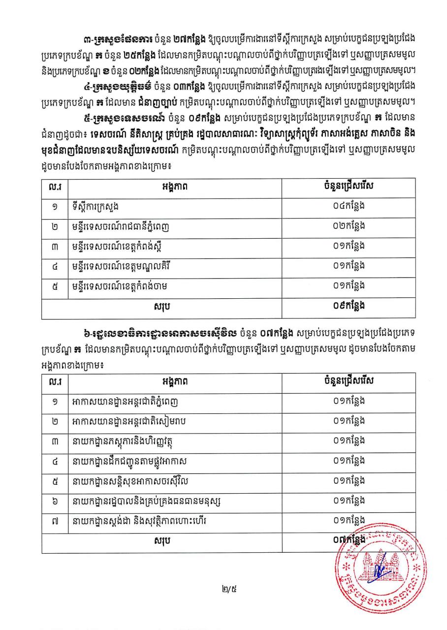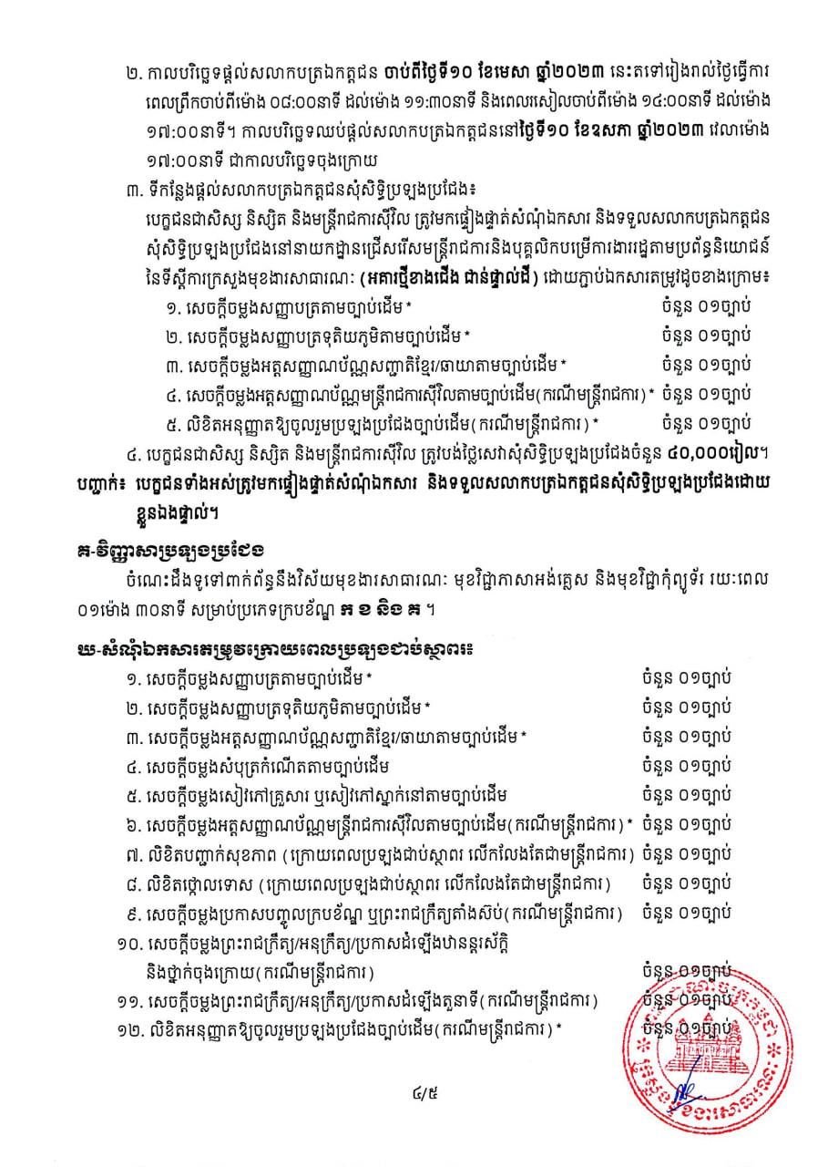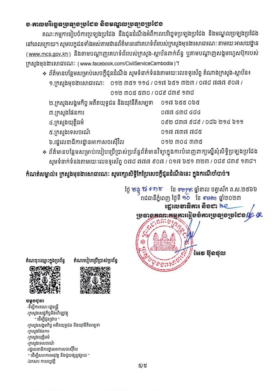 (ភ្នំពេញ)៖ ក្រសួងស្ថាប័នចំនួន៦ រួមមានក្រសួងមុខងារសាធារណៈ ក្រសួងសង្គមកិច្ច អតីតយុទ្ធជន និងយុវនីតិសម្បទាន ក្រសួងផែនការ ក្រសួងទេសចរណ៍ ក្រសួងយុត្តិធម៌ និងរដ្ឋលេខាធិការដ្ឋានអាកាសចរស៉ីវិល ត្រូវបានអនុញ្ញាតឲ្យរៀបចំប្រឡងប្រជែងជ្រើសរើសនិស្សិត និងមន្រ្តីរាជការឱ្យចូលបម្រើការងារ សរុប១៧២កន្លែង សម្រាប់ឆ្នាំ២០២៣។ នេះបើតាមលិខិតរបស់ ក្រសួងមុខងារសាធារណៈដែលបណ្តាញព័ត៌មាន Fresh News ទទួលបាននៅព្រឹកថ្ងៃទី១៣ ខែមេសានេះ៕