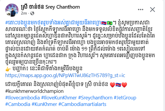 រាជធានីភ្នំពេញ៖ នៅថ្ងៃទី១៣ ខែមេសា ឆ្នាំ២០២៣ យោងតាមគណនីហ្វេសប៊ុកផ្ទាល់របស់ ឧកញ៉ា ស្រី ចាន់ថន បានប្រកាសដល់សាធារណៈជនឱ្យបានជ្រាបថា នៅថ្ងៃស្អែក កីឡាករប្រដាល់ Thiago Teixeira នឹងមកទទួលលិខិតផ្លូវការសញ្ជាតិខ្មែរនៅសួនកម្សាន្តជេតស៍ហ្គាឌិនផាកវិហារសួគ៌។