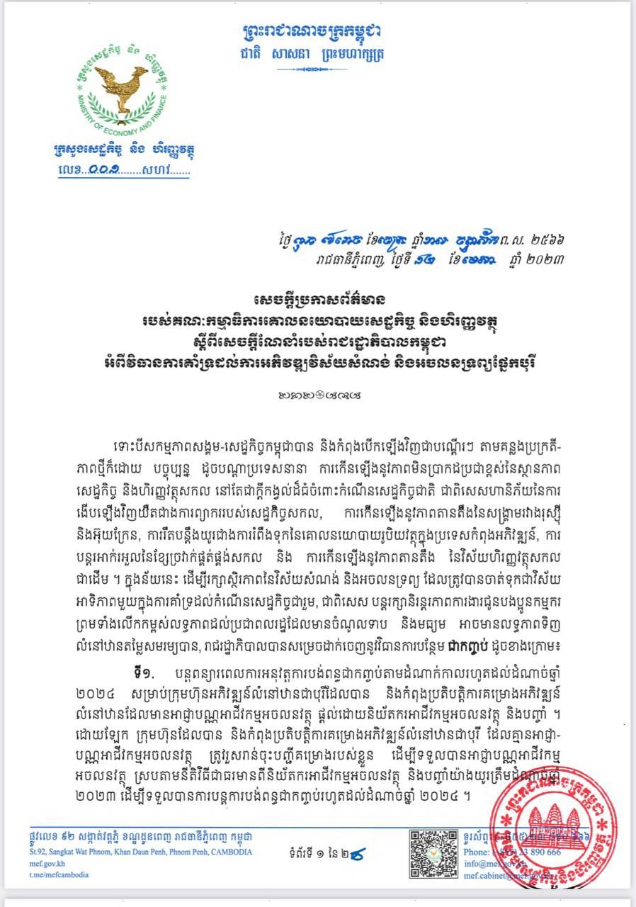សេចក្តីប្រកាសព័ត៌មានបានឲ្យដឹងថា ទោះបីសកម្មភាពសង្គម-សេដ្ឋកិច្ចកម្ពុជា បាន និងកំពុងបើកឡើងវិញជាបណ្តើរៗ តាមគន្លងប្រក្រតីភាពថ្មីក៏ដោយ បច្ចុប្បន្នដូចបណ្តាប្រទេសនានា ការកើនឡើងនូវភាពមិនប្រាកដប្រជាខ្ពស់នៃស្ថានភាពសេដ្ឋកិច្ច និងហិរញ្ញវត្ថុសកល នៅតែជាក្តីកង្វល់ដ៏ ធំចំពោះកំណើនសេដ្ឋកិច្ចជាតិ ជាពិសេសហានិភ័យនៃការងើបឡើងវិញ យឺតជាងការព្យាកររបស់សេដ្ឋកិច្ចសកល ការកើនឡើងនូវភាពតានតឹងនៃសង្គ្រាមរវាងរុស្ស៊ី និងអ៊ុយក្រែន, ការរឹតបន្តឹងយូរជាងការរំពឹងទុកនៃគោលនយោបាយរូបិយវត្ថុ ក្នុងប្រទេសកំពុងអភិវឌ្ឍន៍, ការបន្តរអាក់រអួលនៃខ្សែច្រវាក់ផ្គត់ផ្គង់សកល និងការកើនឡើងនូវភាពតានតឹង នៃវិស័យហិរញ្ញវត្ថុសកលជាដើម ។ ក្នុងន័យនេះ ដើម្បីរក្សាស្ថិរភាពនៃវិស័យសំណង់ និងអចលនទ្រព្យ ដែលត្រូវបានចាត់ទុកជាវិស័យអាទិភាពមួយ ក្នុងការគាំទ្រដល់កំណើនសេដ្ឋកិច្ចជារួម, ជាពិសេស បន្តរក្សានិរន្តរភាពការងារជូនបងប្អូនកម្មករ ព្រមទាំងលើកកម្ពស់លទ្ធភាពដល់ប្រជាពលរដ្ឋ ដែលមានចំណូលទាប និងមធ្យម អាចមានលទ្ធភាពទិញ លំនៅឋានតម្លៃសមរម្យបាន, រាជរដ្ឋាភិបាលបានសម្រេចដាក់ចេញនូវវិធានការបន្ថែមជាកញ្ចប់ ដូចខាងក្រោម៖