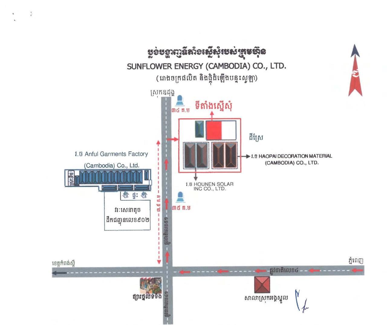 ៧៖ SUNFLOWER ENERGY (CAMBODIA) CO., LTD គម្រោងបង្កើតរោងចក្រផលិត និងផ្គុំដំឡើងបន្ទះសូឡា ដែលមានទីតាំងវិនិយោគស្ថិតនៅភូមិក្តាន់រយ ឃុំដំណាក់អំពិល ស្រុកអង្គស្នួល ខេត្តកណ្តាល ក្នុងទុនវិនិយោគប្រមាណ១៥.៦លានដុល្លារ និងអាចបង្កើតការងារ បានចំនួន៣៣៩កន្លែង។
