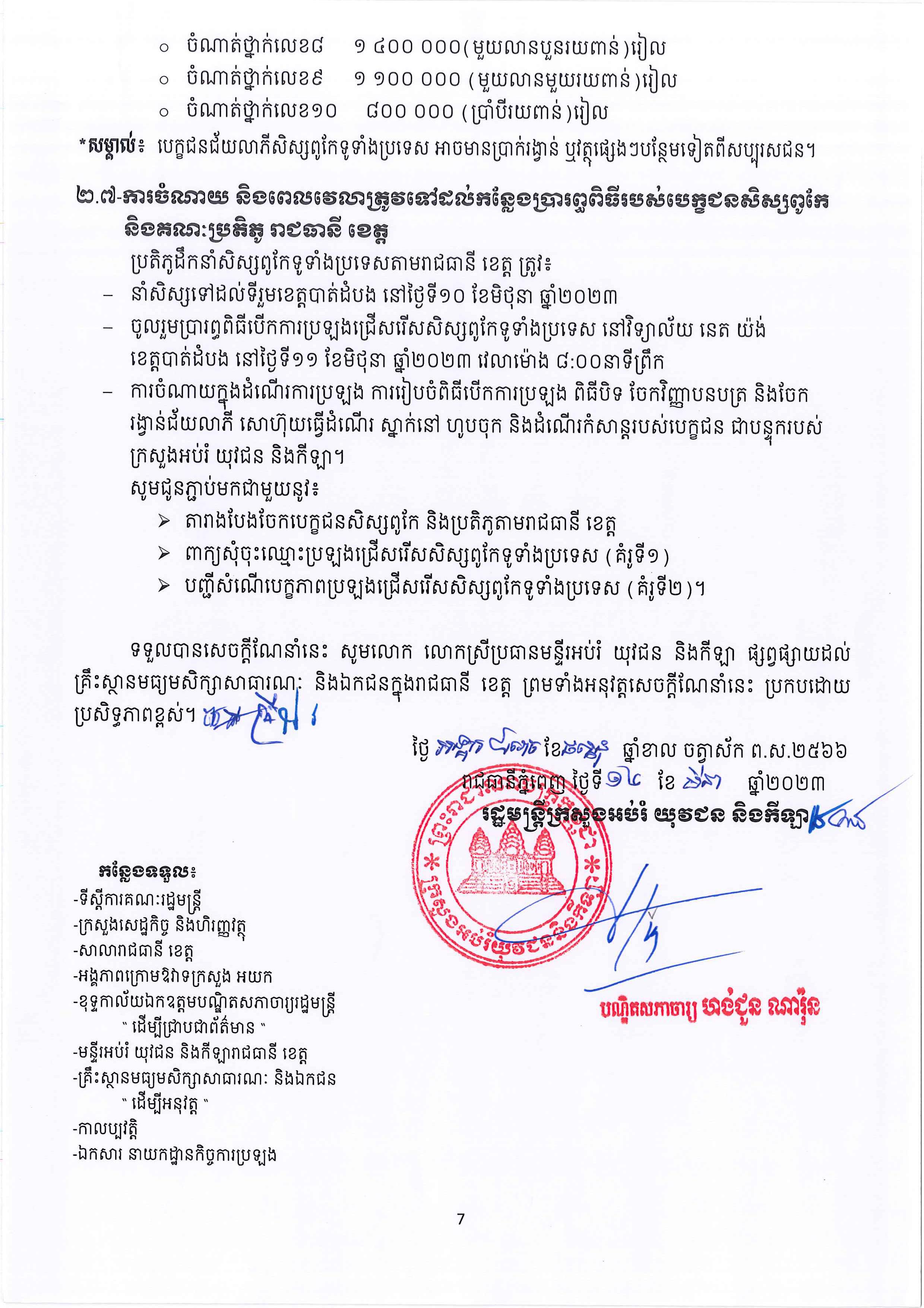 (ភ្នំពេញ)៖ បណ្ឌិតសភាចារ្យ ហង់ជួន ណារ៉ុន រដ្ឋមន្ត្រីក្រសួងអប់រំ យុវជន និងកីឡា បានចេញសេចក្ដីណែនាំ ស្ដីពីការរៀបចំ និងការប្រព្រឹត្ដទៅនៃការប្រឡងជ្រើរើសសិស្សពូកែ ប្រចាំរាជធានី ខេត្ដ និងទូទាំងប្រទេស សម្រាប់ឆ្នាំសិក្សា ២០២២-២០២៣៕