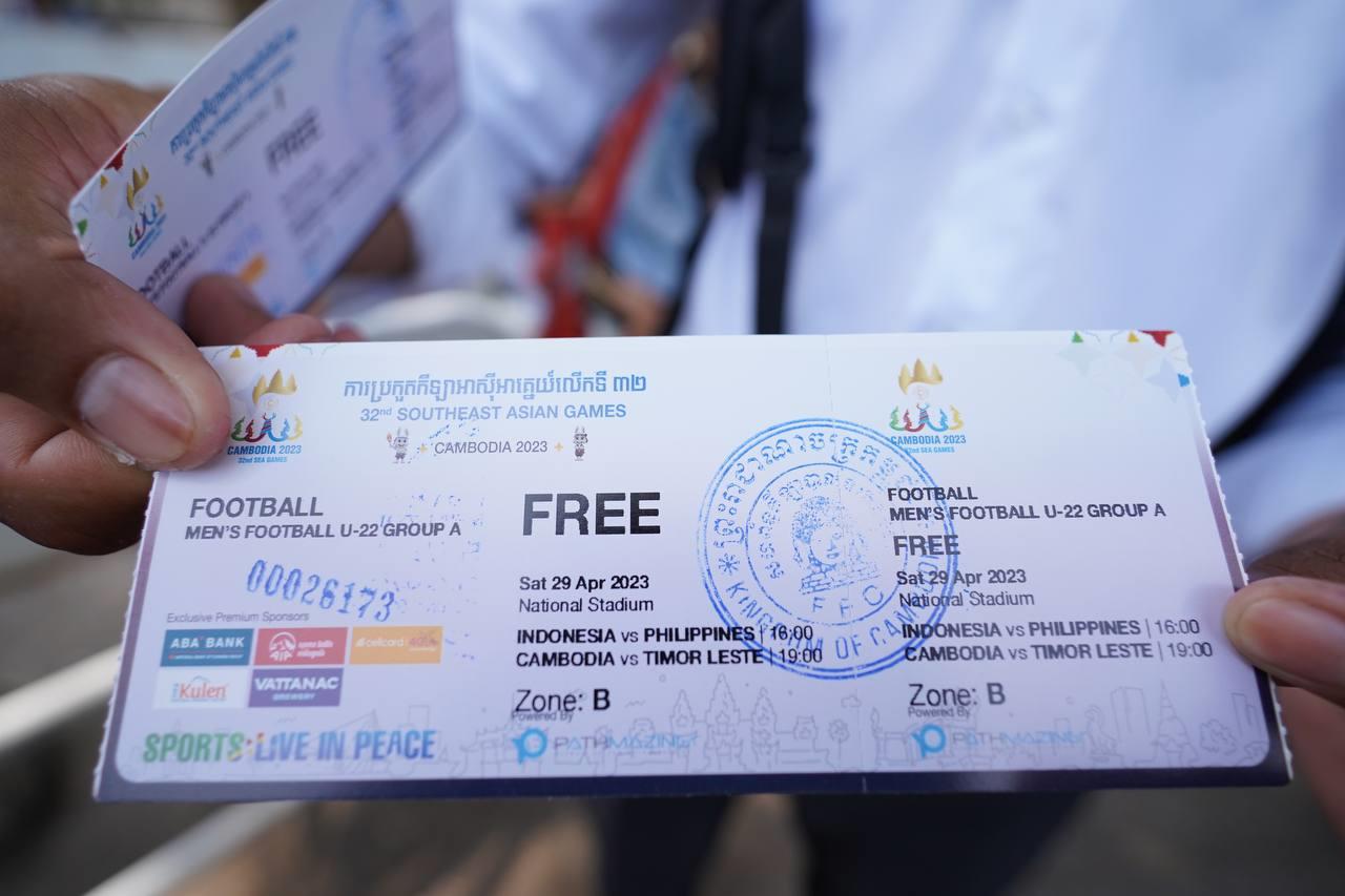 (ភ្នំពេញ)៖ សំបុត្រសម្រាប់ការប្រកួតនៅថ្ងៃទី២៩ ខែមេសា ឆ្នាំ២០២៣ រវាងក្រុម U22 ឥណ្ឌូនេស៊ី និងហ្វីលីពីន និងការប្រកួតរវាងម្ចាស់ផ្ទះកម្ពុជា ជួបទីម័រខាងកើត នៅពហុកីឡដ្ឋានជាតិអូឡាំពិក ដែលត្រូវបានចែកចាប់ពីថ្ងៃចន្ទ ទី២៤ ខែមេសា ឆ្នាំ២០២៣ វេលាម៉ោង ១២ថ្ងៃត្រង់នេះបានអស់ហើយ សម្រាប់ទីតាំងចែកនៅមុខពហុកីឡដ្ឋានជាតិអូឡាំពិក។ នេះបើតាមសេចក្តីរាយការណ៍ពីភ្នាក់ងារ Fresh News ដែលបានចុះទៅដល់ទីតាំងផ្ទាល់។