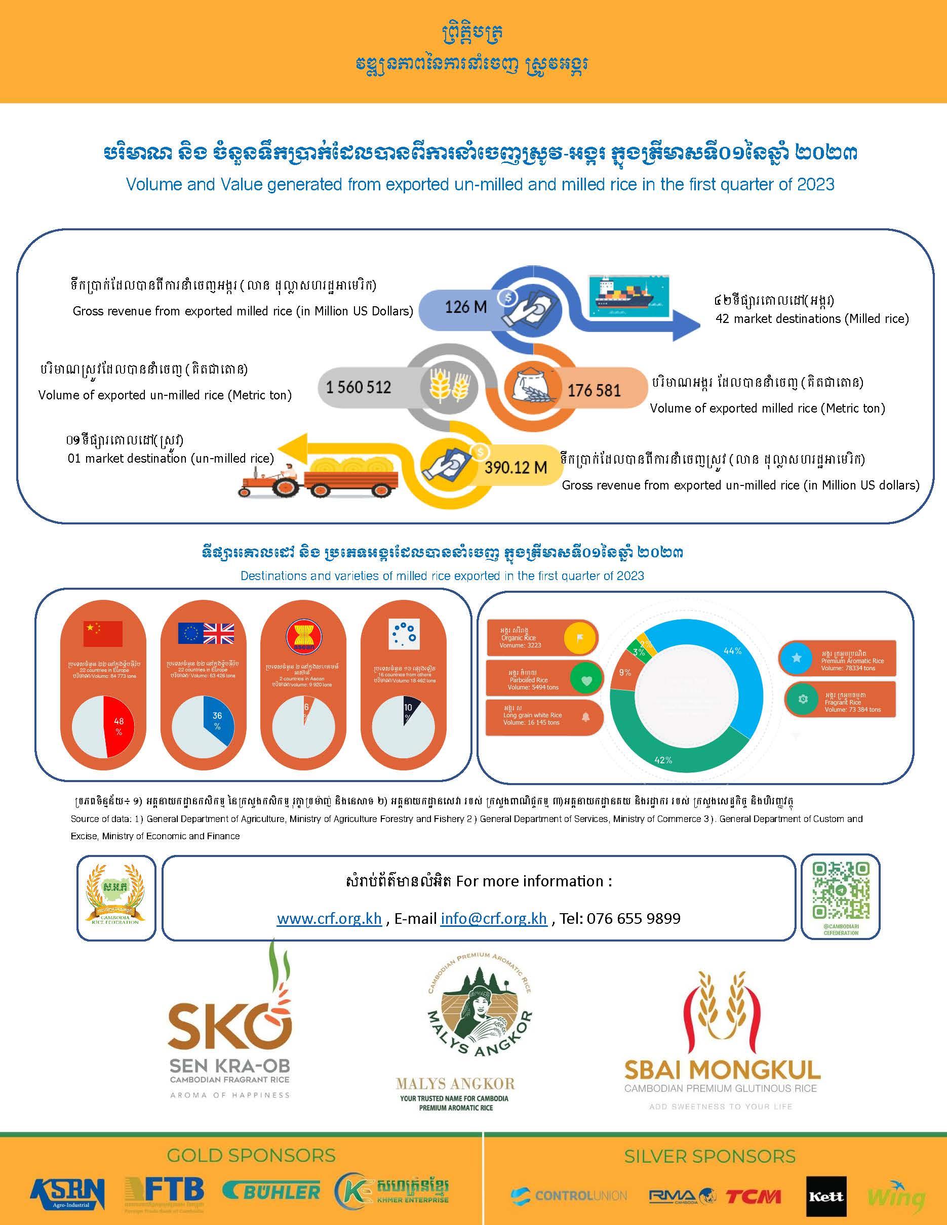នៅត្រីមាសទី១ ឆ្នាំ២០២៣ កម្ពុជានាំចេញអង្ករបាន ១៧៦៥៨១តោន ទៅកាន់៤២ទីផ្សារគោលដៅ។ ដោយឡែកបរិមាណស្រូវ ដែលបាននាំចេញចំនួន ១,៥៦០,៥១២តោន ទៅកាន់ប្រទេសវៀតណាម។