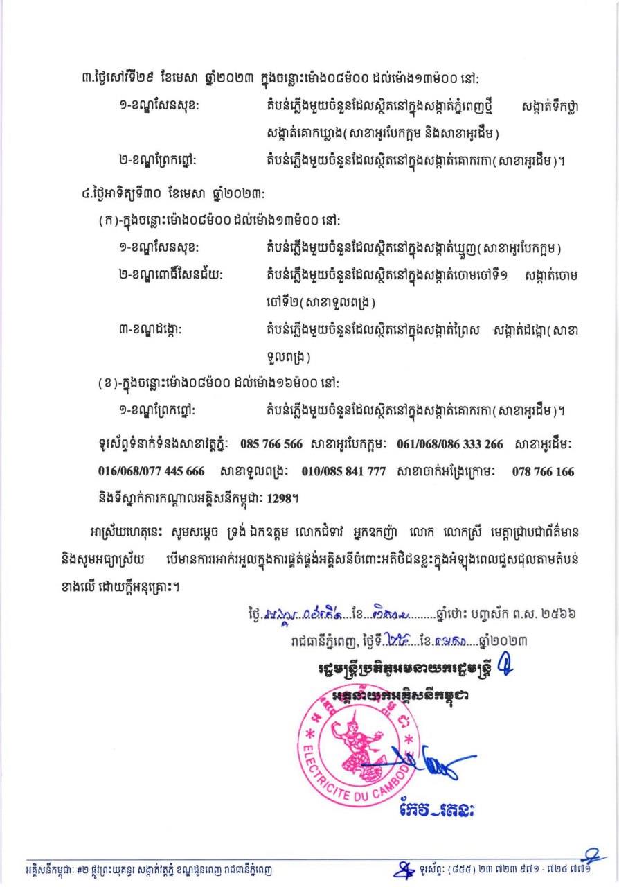 EDC ជូនដំណឹងពីការរអាក់រអួលចរន្ត ចាប់ពីថ្ងៃនេះដល់ថ្ងៃទី៣០ ខែមេសា ដើម្បីរុះរើគន្លង ខ្សែបណ្តាញ ផ្លាស់ប្តូរ តម្លើងបរិក្ខារ ងាយស្រួលដល់ការដ្ឋានពង្រីកផ្លូវ