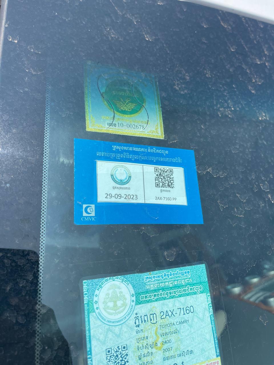 ៩- រថយន្តម៉ាក Camry ចង្កូត ឆ្វេង ពណ៌ស ផលិតឆ្នាំ 2007 ពាក់ស្លាកលេខ ភ្នំពេញ 2U-4932
