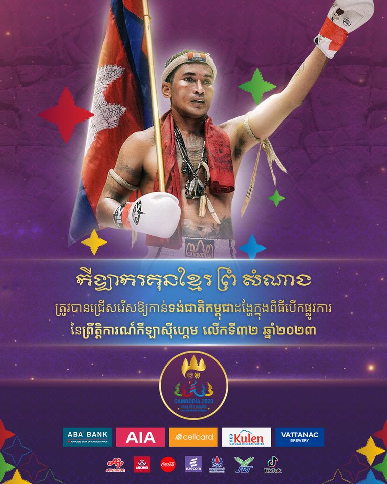 (ភ្នំពេញ)៖ នៅសល់រយៈពេល ៤ថ្ងៃទៀតប៉ុណ្ណោះ ពិធីបើកការប្រកួតកីឡាស៊ីហ្គេម លើកទី៣២ នៅកម្ពុជា នឹងមកដល់ ពោលគឺនៅល្ងាចថ្ងៃទី០៥ ខែឧសភា ឆ្នាំ២០២៣ ខាងមុខ ខណៈម្ចាស់ផ្ទះកម្ពុជាបានជ្រើសរើសកីឡាករជម្រើសជាតិប្រដាល់គុនខ្មែរ ព្រំ សំណាង ដើម្បីកាន់ទង់ជាតិកម្ពុជាដង្ហែក្នុងពិធីបើកព្រឹត្តិការណ៍ជាប្រវត្តិសាស្ដ្រនៅកម្ពុជា។ នេះបើតាមការជូនដំណឹងលើទំព័រហ្វេសប៊ុកផ្លូវការរបស់គណៈកម្មាធិការជាតិ CAMSOC។