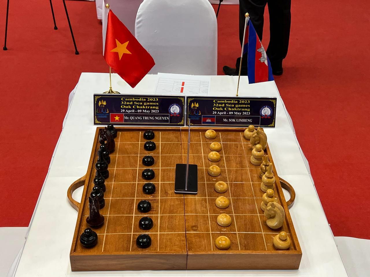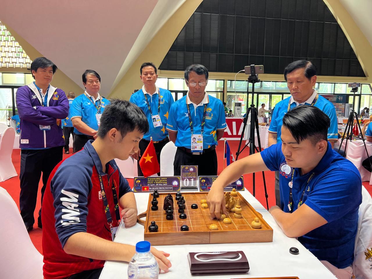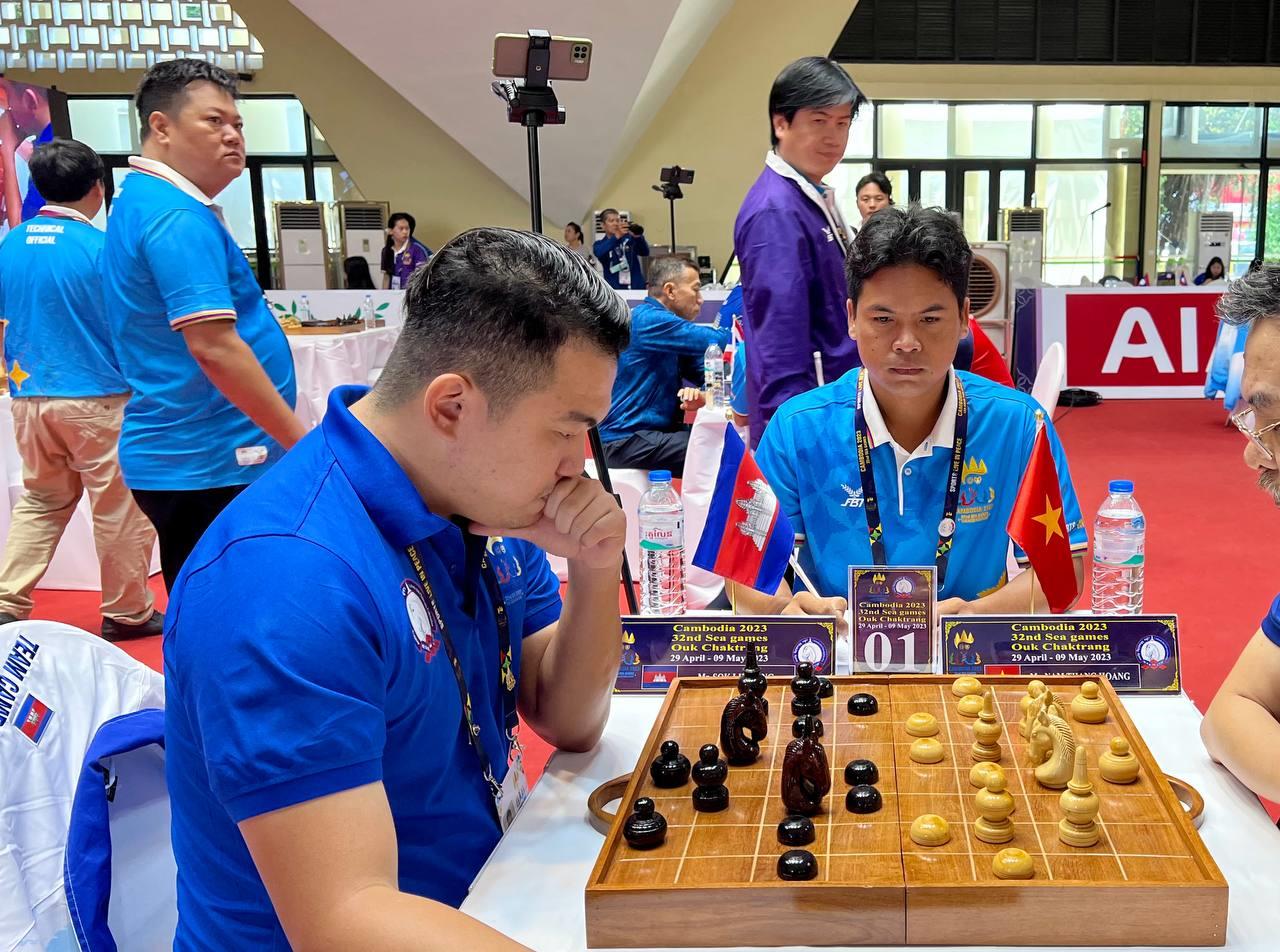(ភ្នំពេញ)៖ កីឡាករ សុខ លឹមហេង ដណ្ដើមបានមេដាយមាស លើប្រភេទកីឡាអុកចត្រង្គ វិញ្ញាសាឯកត្ដជនបុរស ៥នាទី នៃព្រឹត្តិការណ៍កីឡាស៊ីហ្គេម លើកទី៣២ នៅកម្ពុជាហើយ ក្រោយយកឈ្នះកីឡាករវៀតណាម Quang Trung Nguyen ក្នុងវគ្គផ្ដាច់ព្រ័ត្រ មុននេះបន្ដិច នៅសាលដំបូលទូក នៃសាកលវិទ្យាល័យភូមិន្ទភ្នំពេញ ។
