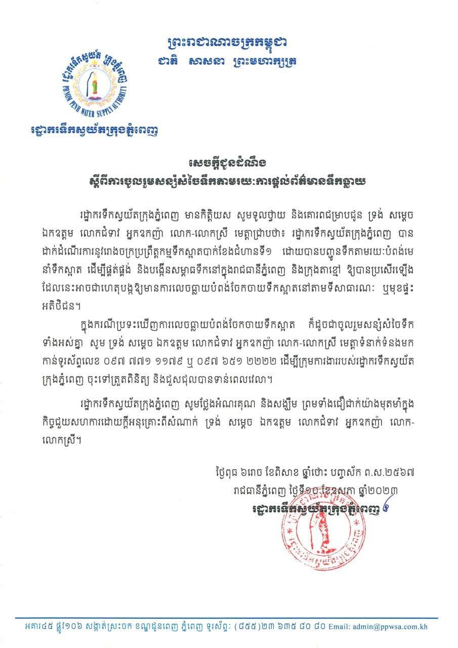 តាមរយៈសេចក្តីជូនដំណឹងនេះរដ្ឋាករទឹកស្វយ័តក្រុងភ្នំពេញ បានឱ្យដឹងថាបន្ទាប់ពីបានដាក់ដំណើរការនូវរោងចក្រប្រព្រឹត្តកម្មទឹកស្អាតបាក់ខែងជំហានទី១ ដោយបានបញ្ចូនទឹកតាមរយៈបំពង់មេនាំទឹកស្អាត ដើម្បីផ្គត់ផ្គង់ និងបង្កើនសម្ពាធទឹកនៅក្នុងរាជធានីភ្នំពេញ និងក្រុងតាខ្មៅ ឱ្យបានប្រសើរឡើងដែលនេះអាចជាហេតុបង្កឱ្យមានការលេចធ្លាយបំពង់ចែកចាយទឹកស្អាតនៅតាមទីសាធារណៈ ឬមុខផ្ទះប្រជាពលរដ្ឋ។