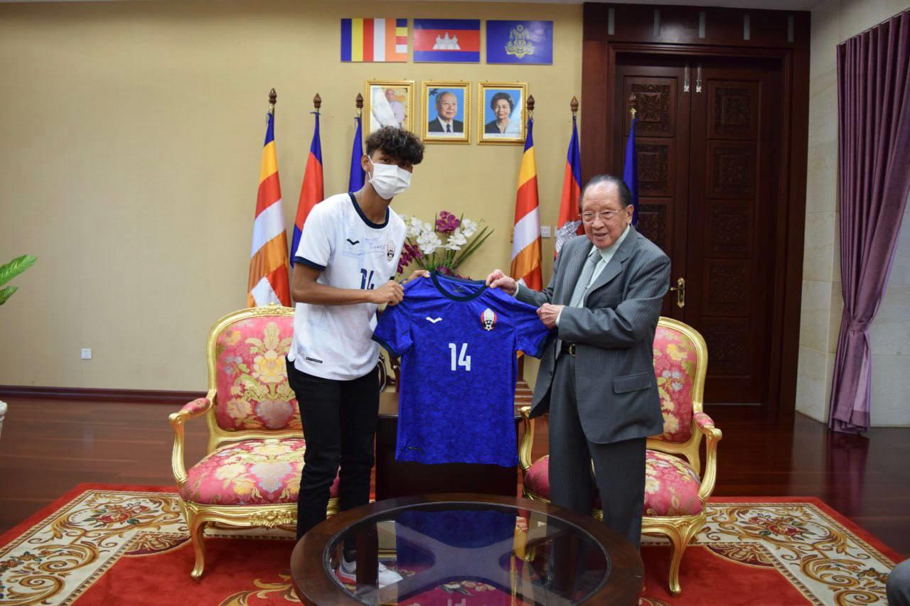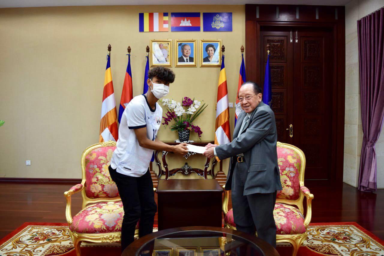 ឧបនាយករដ្ឋមន្ត្រី ហោ ណាំហុង ប្រគល់ថវិកាចំនួន១ម៉ឺនដុល្លារ ដល់កីឡាករ ស៊ិន សុវណ្ណមករា ខណៈកីឡាកររូបនេះជូនអាវលេខ ១៤ដល់លោកវិញ