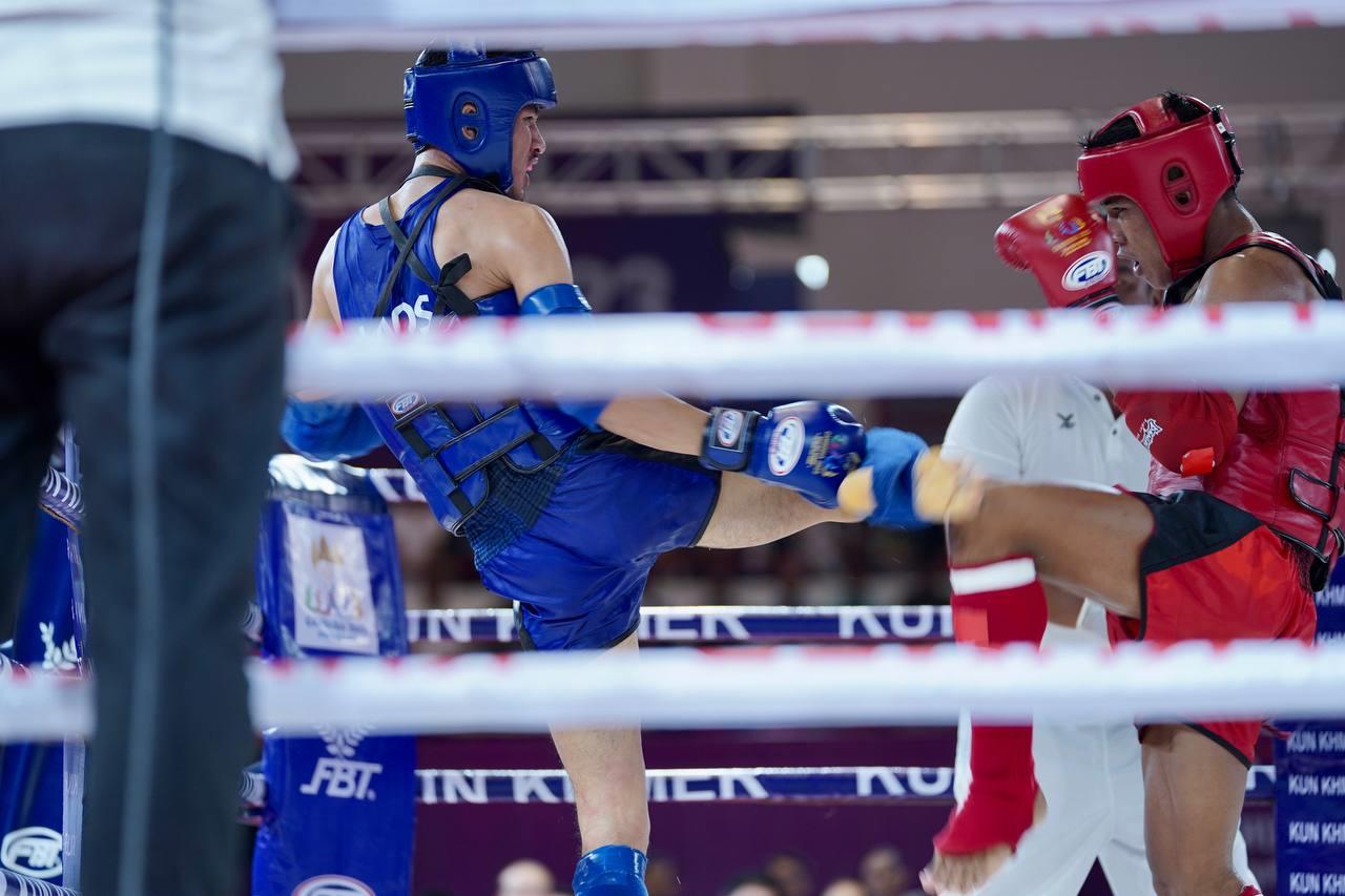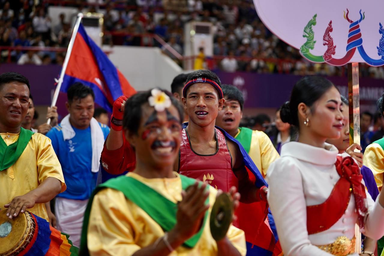 (ភ្នំពេញ)៖ អបអរសារទ កីឡាករគុនខ្មែរ ឈុត សេរីវ៉ាន់ថង ដែលបានឈ្នះមេដាយមាស នៃព្រឹត្តិការណ៍ស៊ីហ្គេម លើកទី៣២ ក្រោយយកឈ្នះកីឡាករឡាវ ATTAXAY SIHABOUT លើវិញ្ញាសាប្រយុទ្ធទម្ងន់ ៦០គីឡូក្រាម ក្នុងជំនួបវគ្គផ្ដាច់ព្រ័ត្រ នៅរសៀលថ្ងៃទី១១ ខែឧសភា ឆ្នាំ២០២៣ ធ្វើឡើងនៅសាលដំរី នៃពហុកីឡដ្ឋានជាតិមរតកតេជោ។