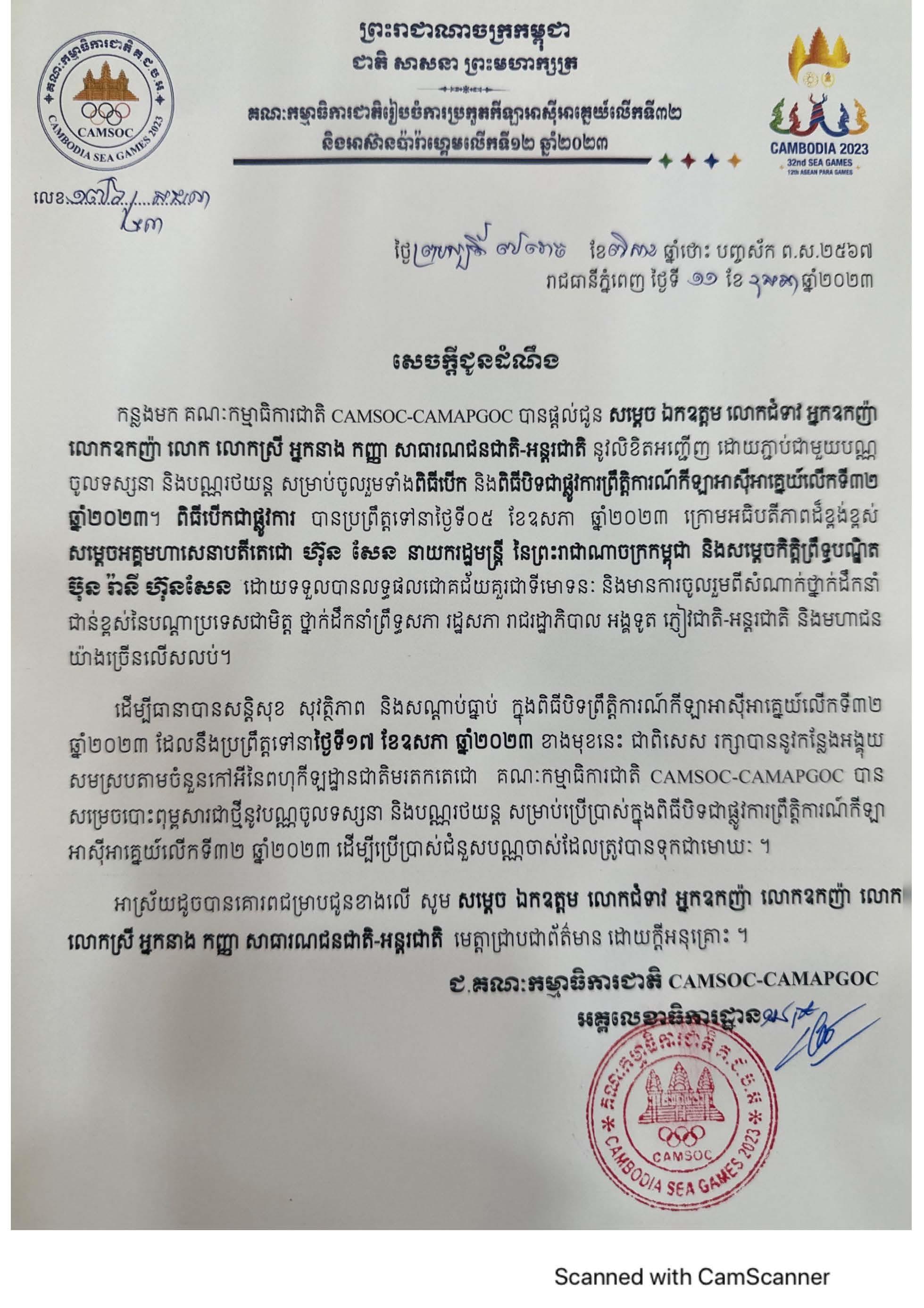 «ដើម្បីធានាបានសន្ដិសុខ សុវត្ថិភាព និងសណ្ដាប់ធ្នាប់ ក្នុងពិធីបិទព្រឹត្តិការណ៍កីឡាស៊ីហ្គេម លើកទី៣២ ឆ្នាំ២០២៣ ដែលនឹងប្រព្រឹត្តទៅនាថ្ងៃទី១៧ ខែឧសភា ឆ្នាំ២០២៣ ខាងមុខ ជាពិសេសរក្សាបាននូវកន្លែងអង្គុយសមស្របតាមចំនួនកៅអីនៃពហុកីឡដ្ឋានជាតិមរតកតេជោ គណៈកម្មាធិការជាតិ CAMSOC-CAMAPGOC បានសម្រេចបោះពុម្ភសារជាថ្មីនូវបណ្ណចូលទស្សនា និងបណ្ណរថយន្ដ សម្រាប់ប្រើប្រាសស់ក្នុងពិធីបិទជាផ្លូវការ ព្រឹត្តិការណ៍កីឡាស៊ីហ្គេម លើកទី៣២ ដើម្បីប្រើប្រាស់ជំនួសបណ្ណចាស់ដែលត្រូវបានទុកជាមោឃៈ» ។