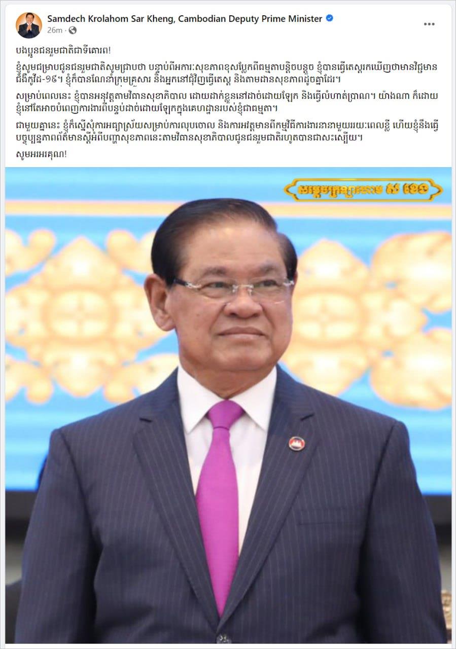 «ខ្ញុំសូមជម្រាបជូនជនរួមជាតិសូមជ្រាបថា បន្ទាប់ពីអការៈសុខភាពខុសប្លែកពីធម្មតាបន្តិចបន្តួច ខ្ញុំបានធ្វើតេស្តរកឃើញថាមានវិជ្ជមានជំងឺកូវីដ-១៩។ ខ្ញុំក៏បានណែនាំក្រុមគ្រួសារ និងអ្នកនៅជុំវិញធ្វើតេស្ត និងតាមដានសុខភាពដូចគ្នាដែរ។ សម្រាប់ពេលនេះ ខ្ញុំបានអនុវត្តតាមវិធានសុខាភិបាល ដោយដាក់ខ្លួននៅដាច់ដោយឡែក និងធ្វើលំហាត់ប្រាណ។ យ៉ាងណាក៏ដោយខ្ញុំនៅតែអាចបំពេញការងារពីបន្ទប់ដាច់ដោយឡែកក្នុងគេហដ្ឋានរបស់ខ្ញុំជាធម្មតា»។