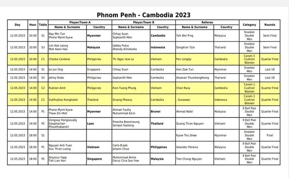 (ភ្នំពេញ)៖ កីឡាការិនីកម្ពុជា ស្រួង ភាវី នឹងធ្វើការប្រកួតប៊ីយ៉ាការ៉ុម១បាំង តទល់ជាមួយកីឡាការិនីថៃ Vutthiphan Kongkaket នៅវេលាម៉ោង២រសៀល ថ្ងៃទី១២ ខែឧសភានេះ នៅផ្សារអ៉ីអន២ ជាន់ទី៣។ នេះជាការប្រកួតវគ្គជម្រុះ។