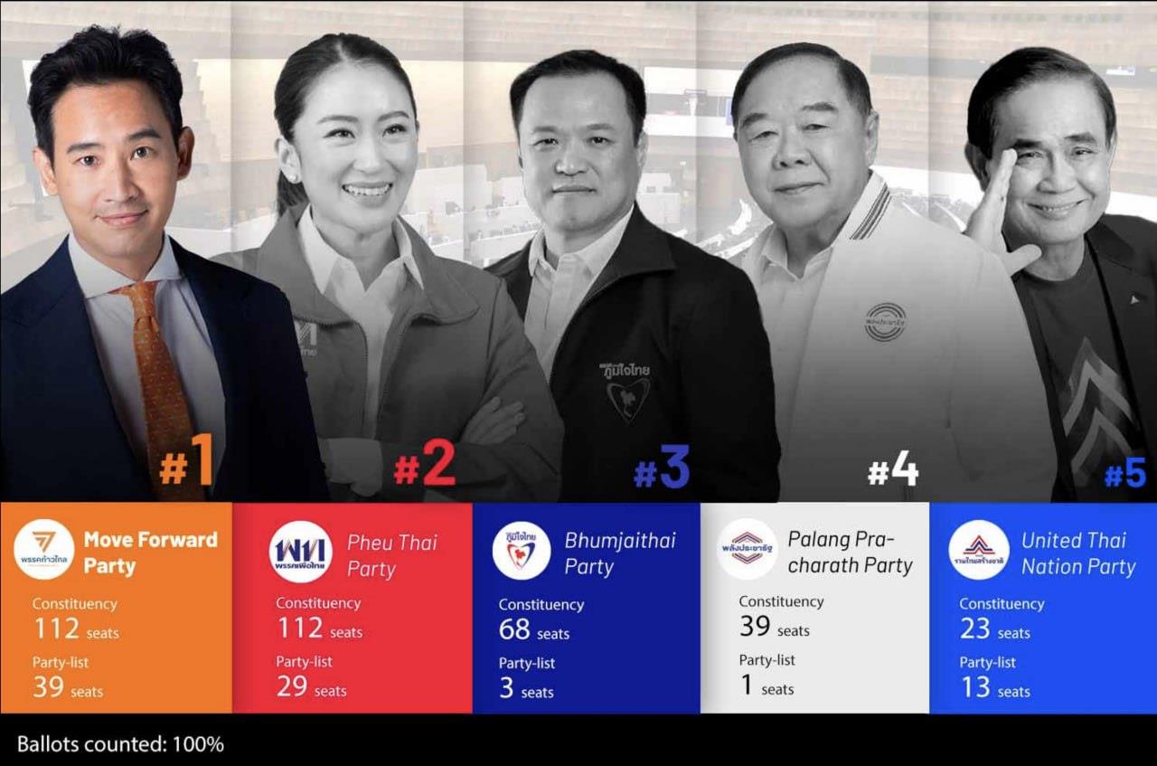 ប្រធានគណៈកម្មការបោះឆ្នោតថៃ លោក អ៉ីតទីផន ប៊ូនប្រាខុង (Ittiporn Boonpracong) បាននិយាយថា គណបក្ស MFP ឈ្នះបានអាសនៈសរុបចំនួន១៥១ ដែលជាចំនួនច្រើនលើសគេ។ បន្ទាប់មកគណបក្ស ភឿថៃ (Pheu Thai) ឈ្នះបាន១៤១អាសនៈ, គណបក្ស ភូមិចាយថៃ (Bhumjaithai) ឈ្នះបាន៧១អាសនៈ, គណបក្ស ប៉ាឡាងប្រាឆារ៉ាត (Palang Pracharath) ឈ្នះបាន៤០អាសនៈ ហើយគណបក្ស ថៃរួបរួមជាតិ (United Thai Nation) ឈ្នះបាន៣៦អាសនៈ។ បើតាមលោក អ៉ីតទីផន ៧៥.២២ភាគរយ នៃប្រជាជនមានសិទ្ធិបោះឆ្នោត បាននាំគ្នាចូលរួមការបោះឆ្នោតសកលកាលពីថ្ងៃអាទិត្យ ដែលជាកំណត់ត្រាថ្មីមួយ លើសពីកំណត់ត្រាចាស់៧៥.០៣ភាគរយ កាលពីឆ្នាំ២០១១។